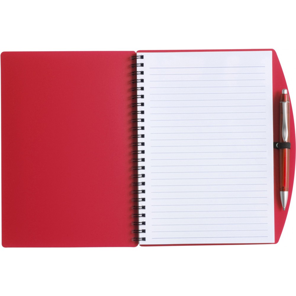 A5-ös spirálfüzet PP borítóval, 65 lapos vonalas tömbbel, műanyag tollal, kék tollbetéttel.