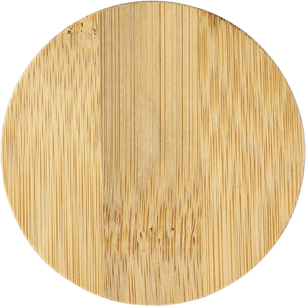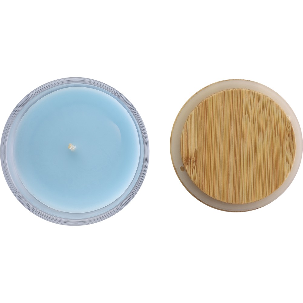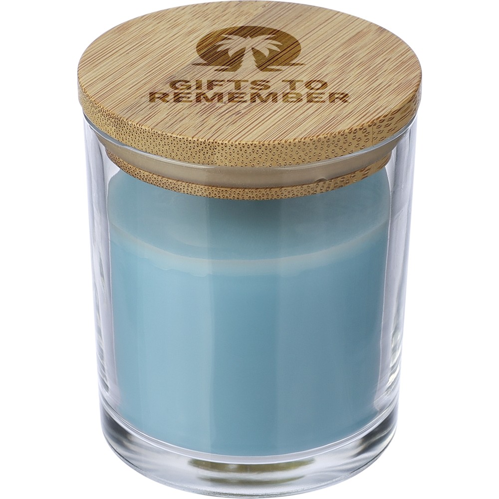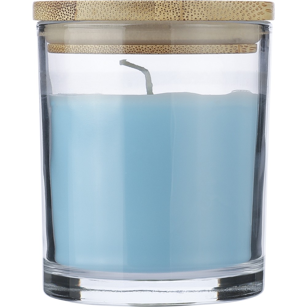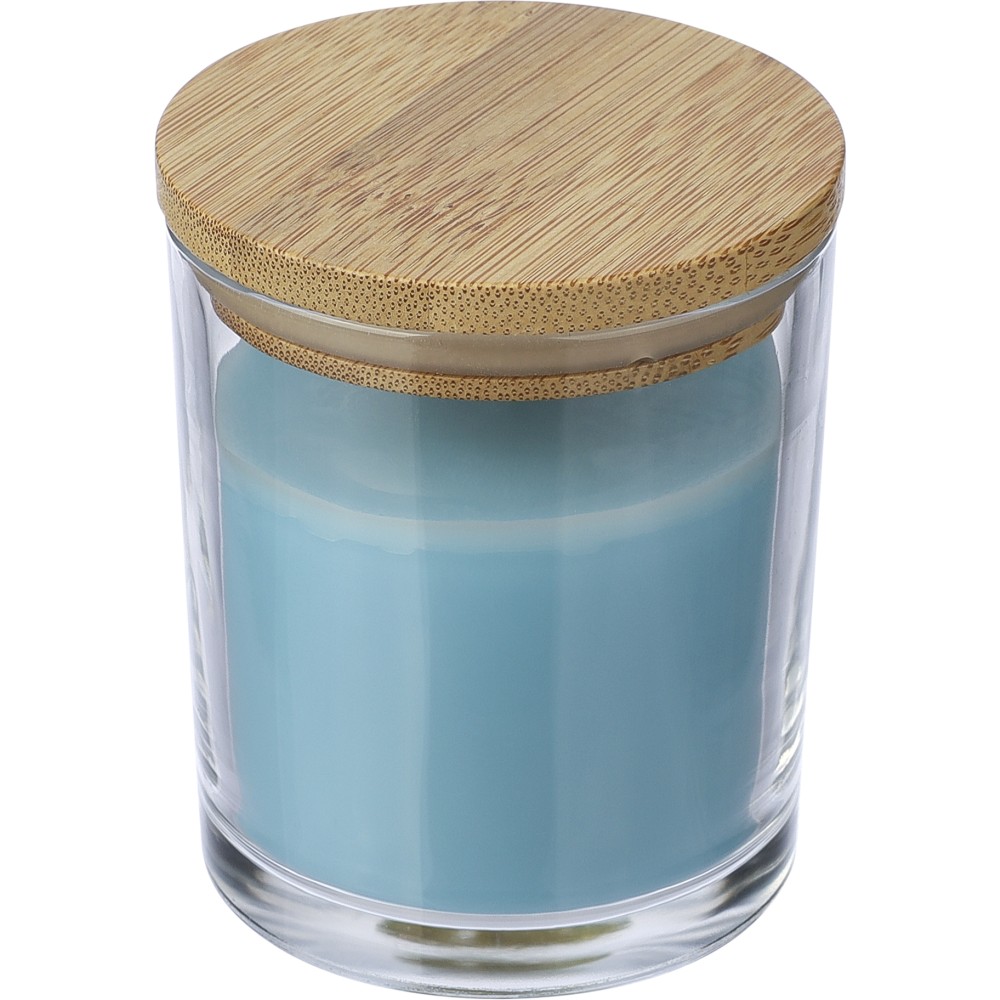 Üveg gyertyatartó 120 g vanília illatú, színes viasszal és bambusz fedéllel. Kb. 20 óra égési idővel. Csomagolása fehér papírhenger.