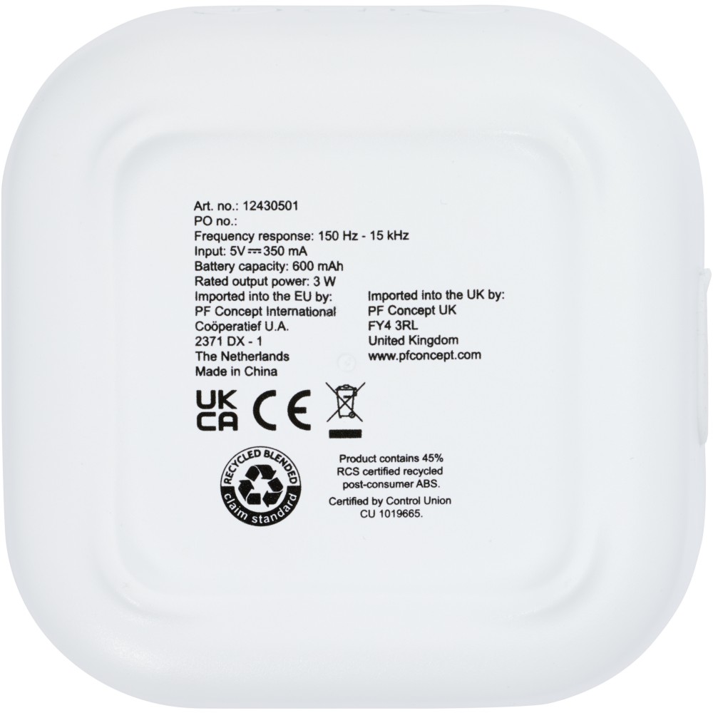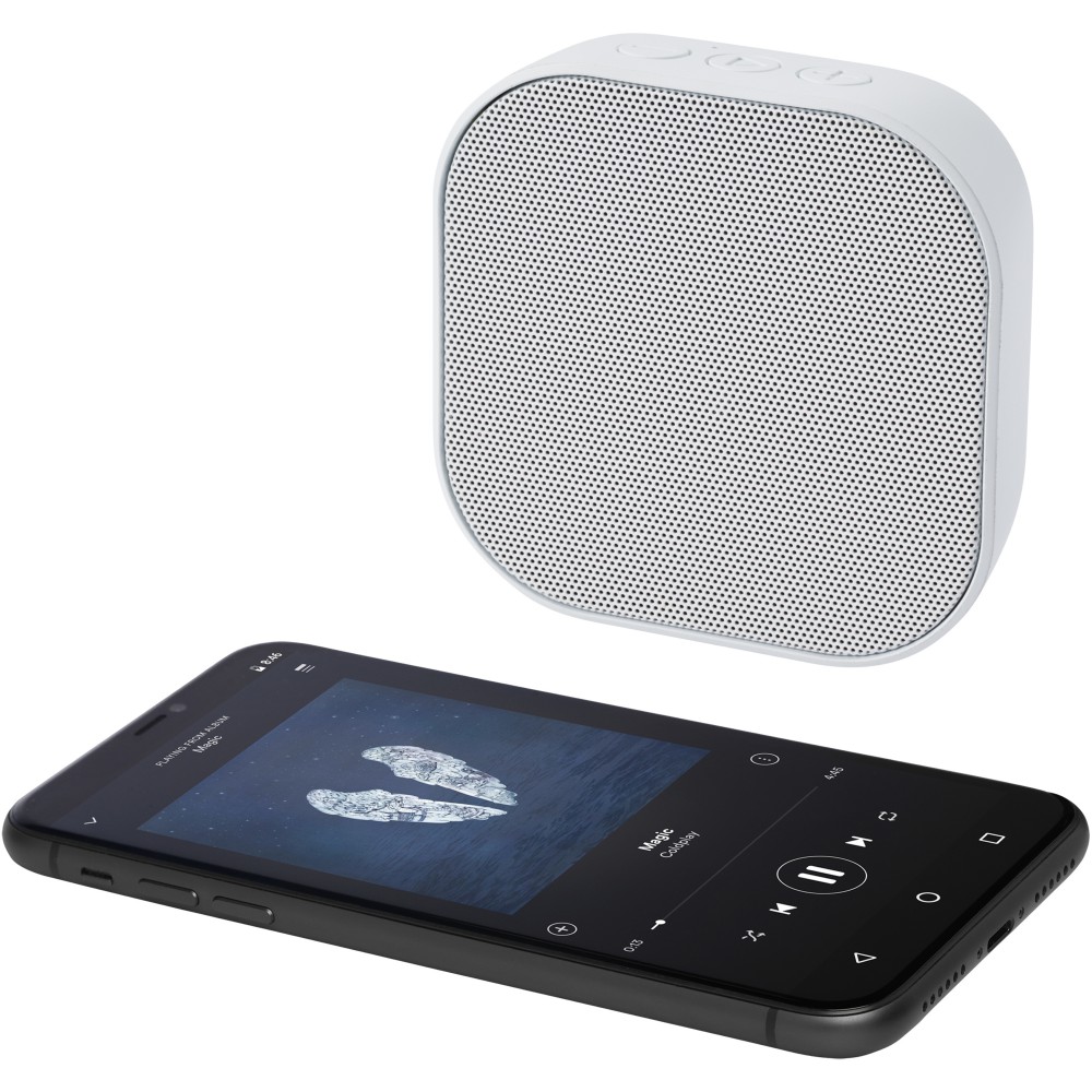 RCS újrahasznosított 3W-os Bluetooth hangszóró, amely zenét, podcastokat, stb. játszik le bármely Bluetooth kompatibilis eszközéről, így ideális társ minden alkalomhoz. A hangszóró beépített vezérlőkkel és mikrofonnal rendelkezik. Élvezze zenéit akár 3-4 órán keresztül maximális hangerőn. A töltési idő 3 óra. Bluetooth 5.3 körülbelül 10 méteres működési hatótávolsággal. Használati útmutatóval, 30 cm-es USB-A-C típusú töltőkábellel és fenntartható forrásból származó, 100%-ban újrahasznosított kartondobozba csomagolva szállítjuk. Újrahasznosított ABS műanyag. Csomagolás: FSC Recycled 100% P5.1 CU-COC-877277.