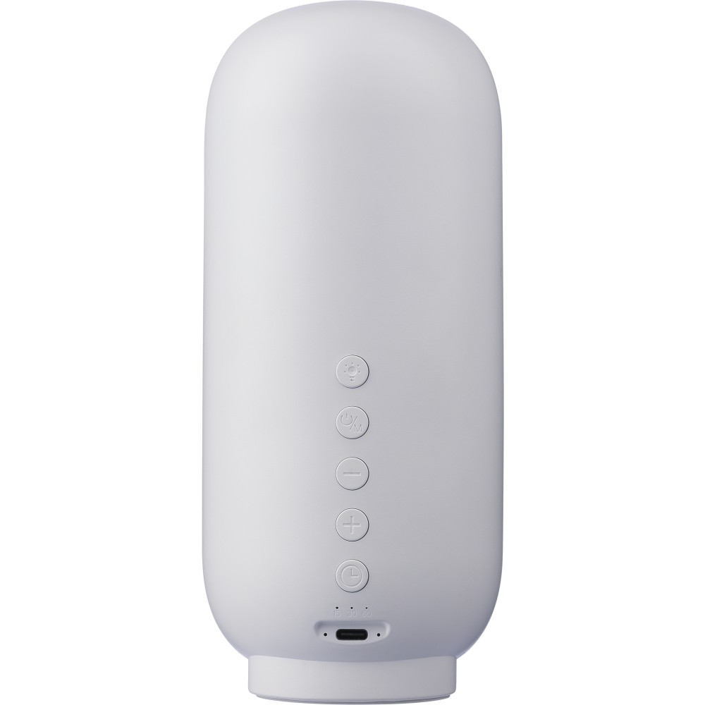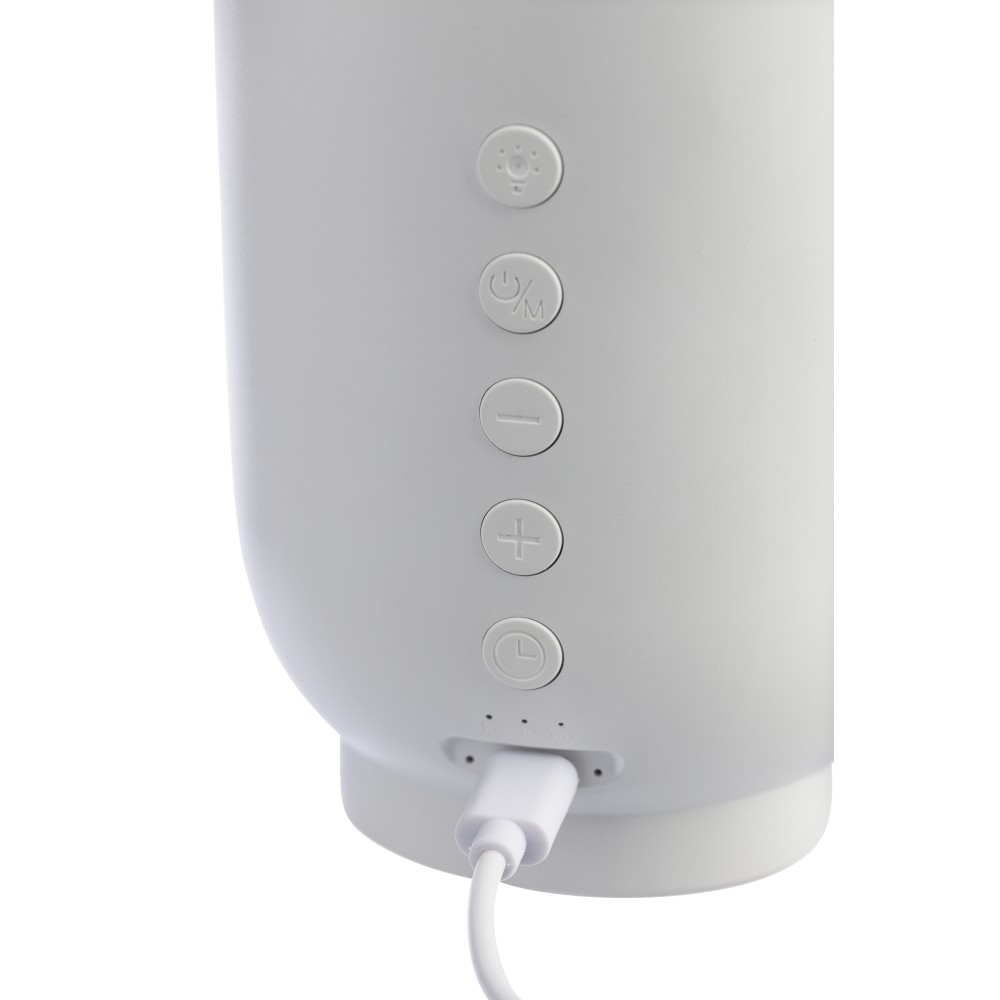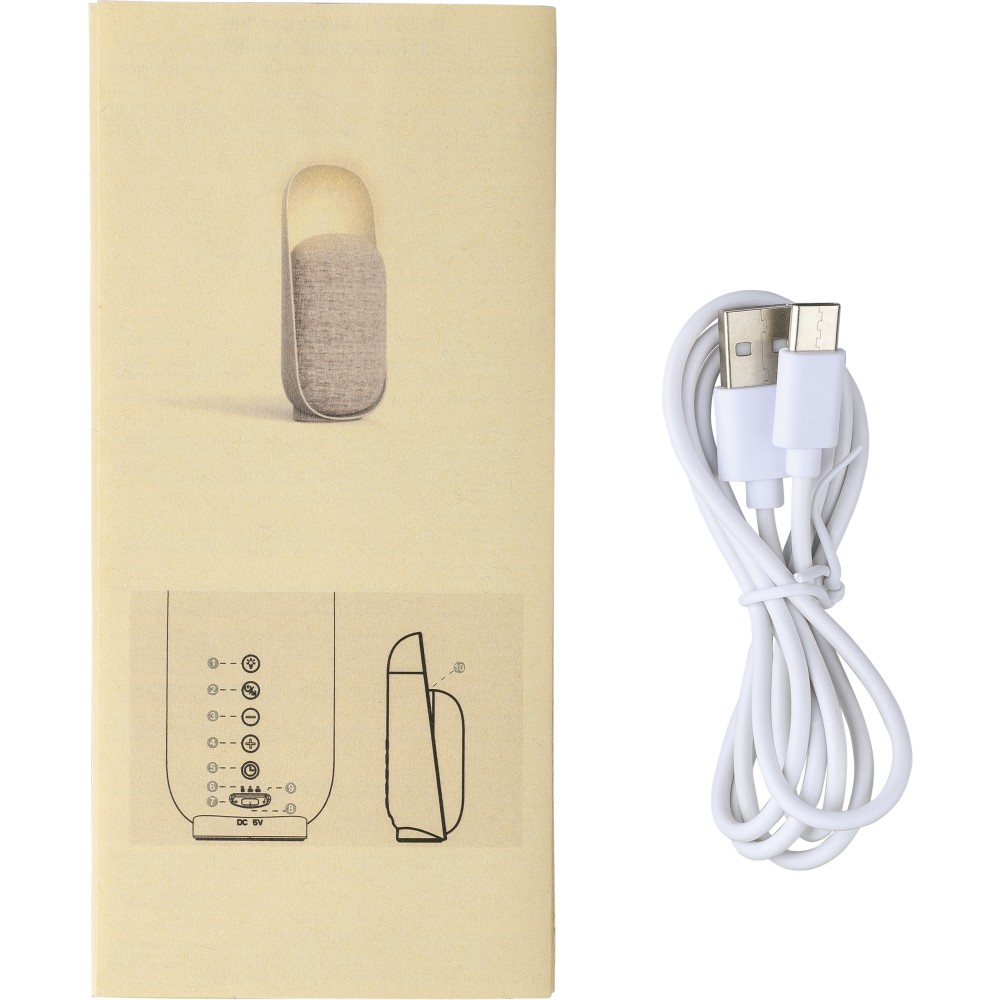 Újrahasznosított ABS és rPET anyagból készült 3-in-1 hangszóró, lámpa és alvásterapeuta. 3W-os hangszóróval, 5.3-as vezeték nélküli technológiával, hatféle alváshoz való hanggal, időzítővel, állítható LED fénnyel és 1200 mAh-s akkumulátorral. 1 m-es kábel tartozik hozzá. Csomagolása barna papírdoboz.