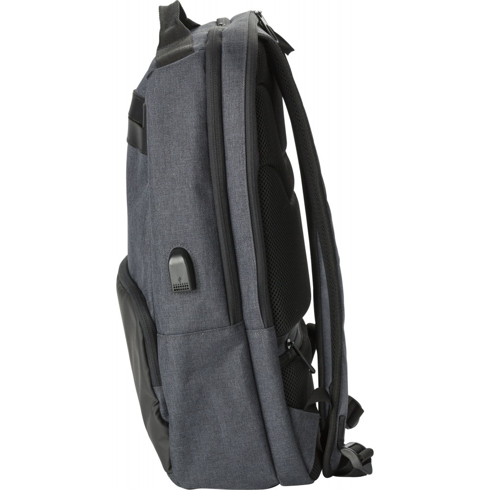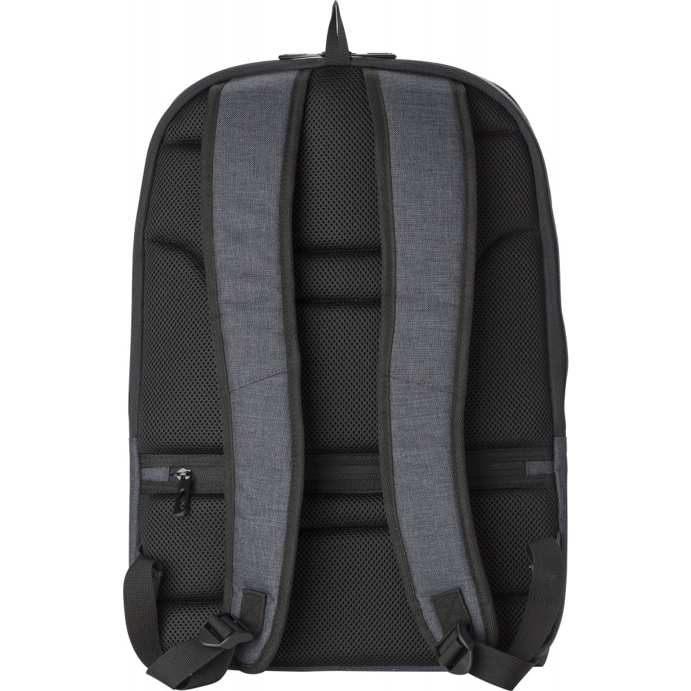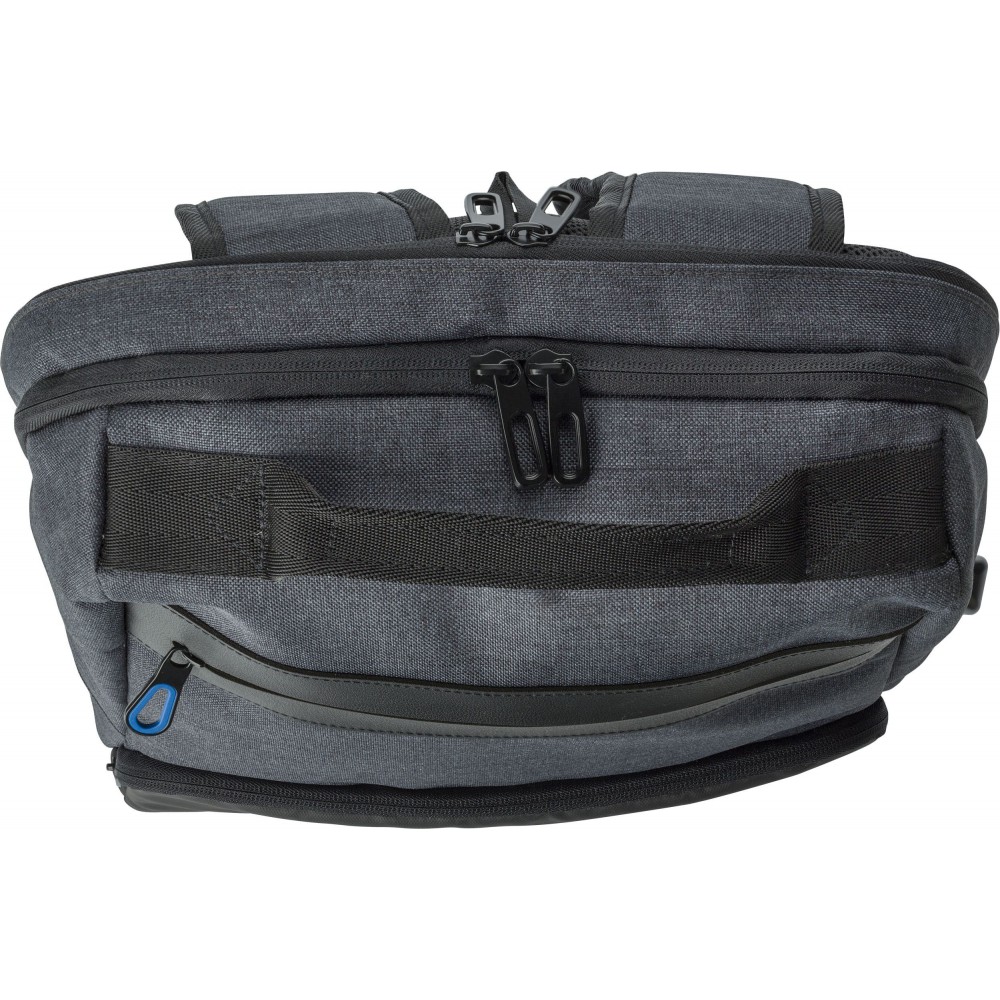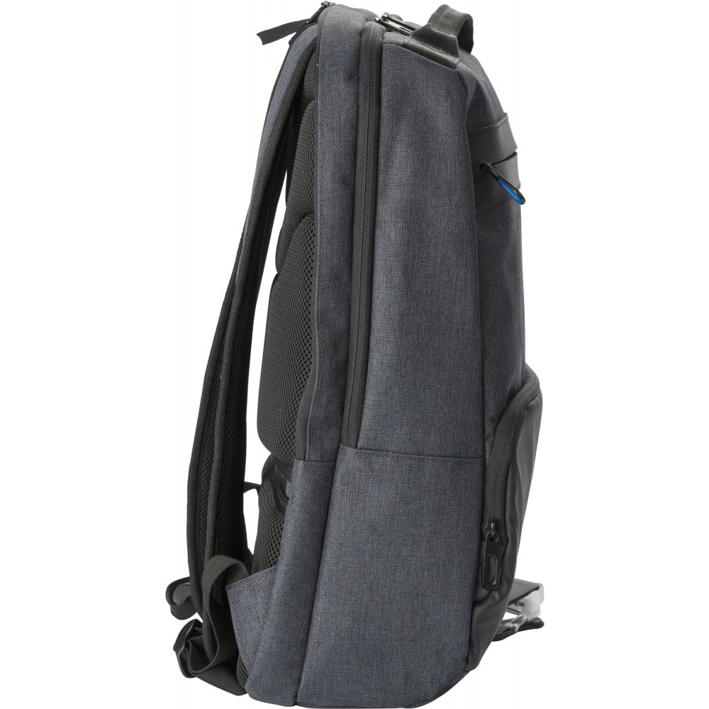 Hátizsák két fő rekesszel, amelyből az egyik laptop tárolására is alkalmas. Hátulján lopásgátló zsebbel és elöl két cipzáras zsebbel rendelkezik. Az oldalán USB csatlakozással. Párnázott, állítható vállpánttal. PVC.