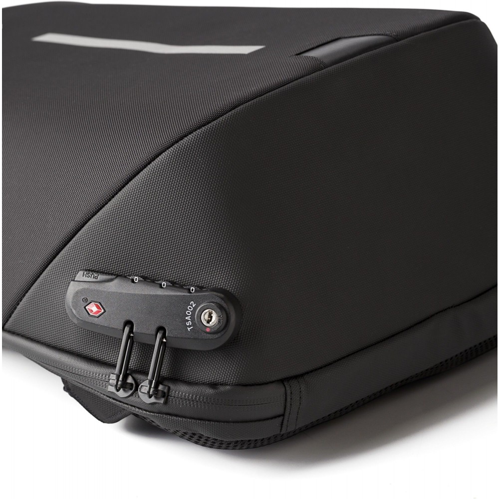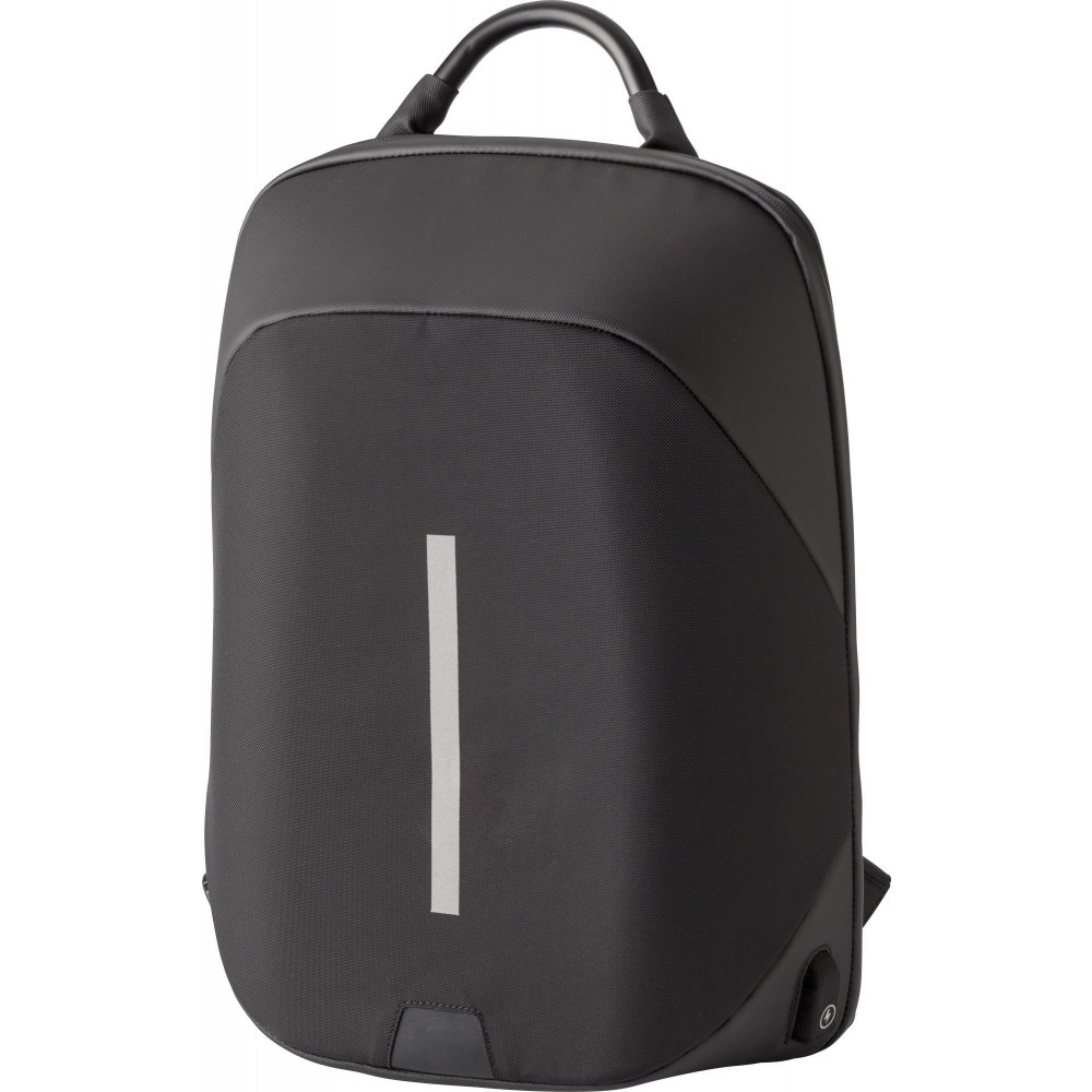 Hátizsák több belső zsebbel, párnázott rész a 15 -es laptop számára, párnázott, állítható vállpánt. 3 karakteres számkonbinációs lakat, fém fül, USB port és vezeték, fényvisszaverő csík, könnyített súlyeloszlást biztosító kialakítás. 1200D nylon anyag.