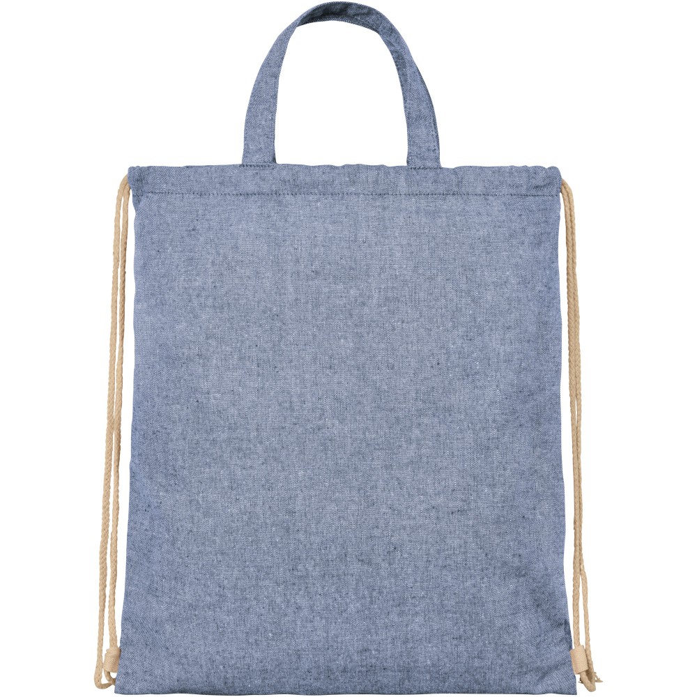 Tornazsák 210 g / m2 újrahasznosított pamut poliészter keverékből. Az újrahasznosított pamut textilipari szabászati hulladékból ered. Az újrahasznosított anyag természetéből fakadóan kisebb eltérések lehetnek a színben. Fülmagasság 14 cm. Teherbírás 5 kg-ig. Újrahasznosított pamut, 210 g/m2, újrahasznosított poliészter.