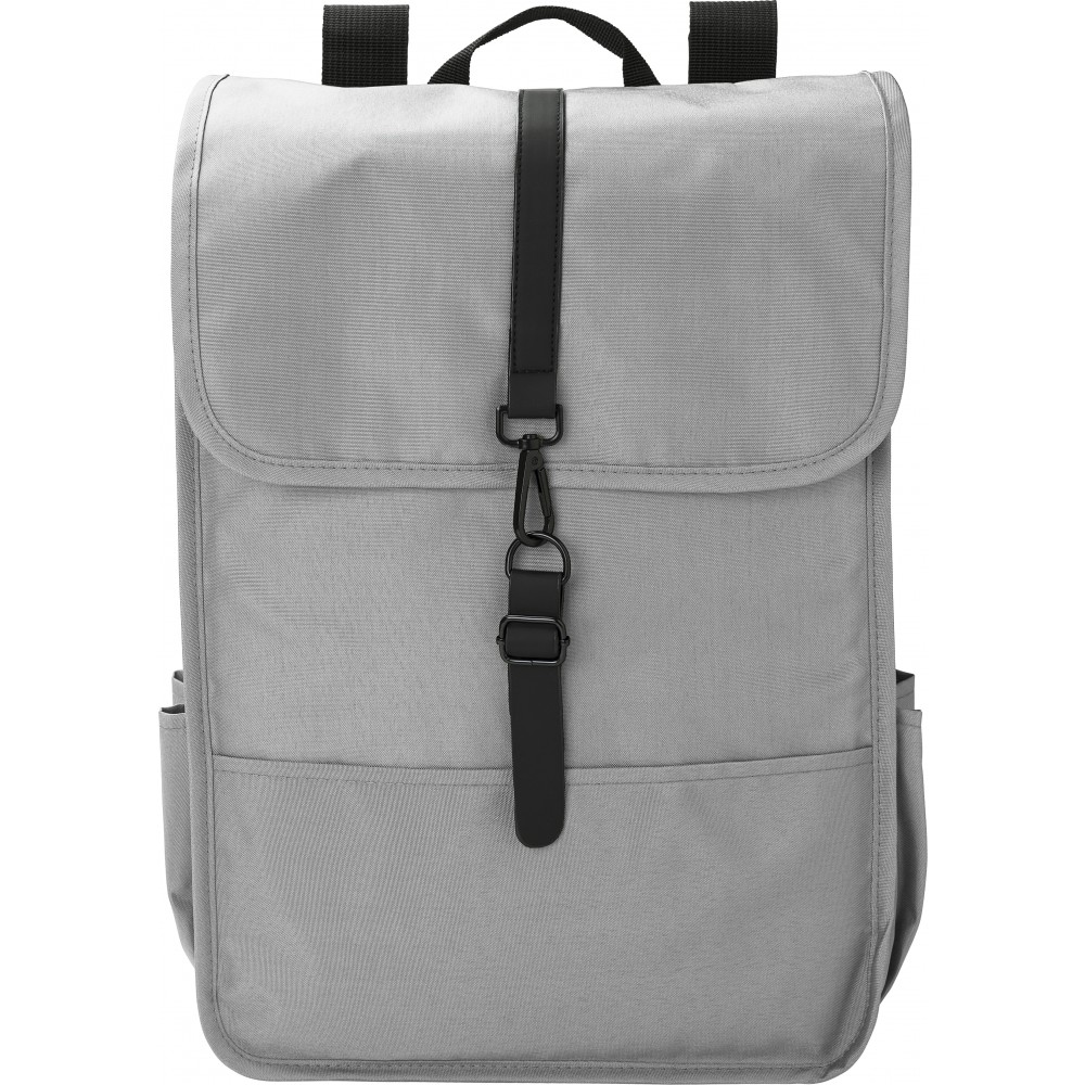 Hátizsák. Két palackzseb az oldalán, egy nagy rekesz. Fekete PU pánttal, csattal zárható. 300D RPET poliészter.