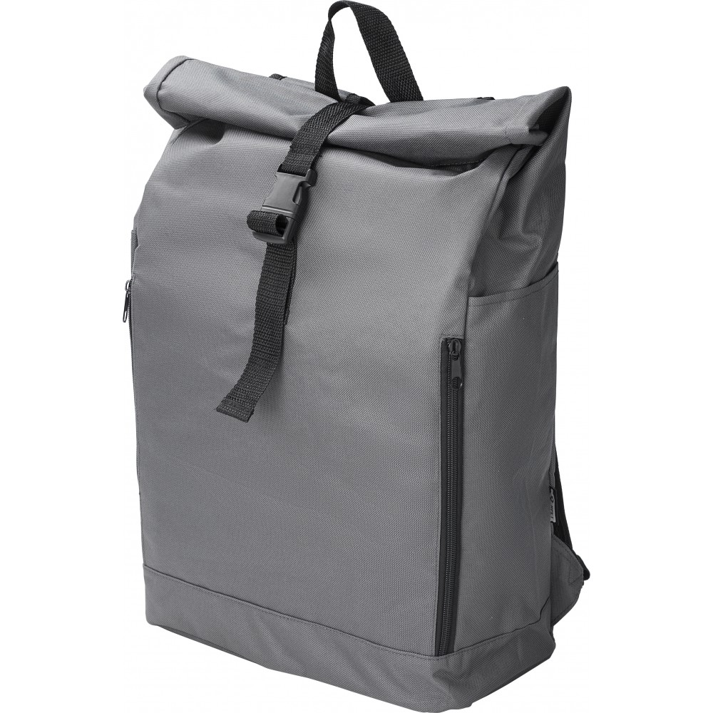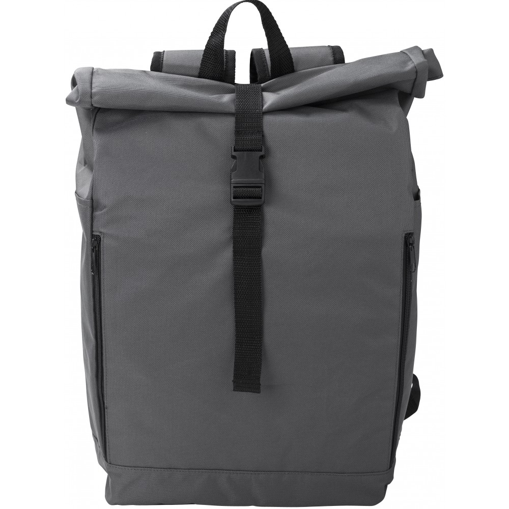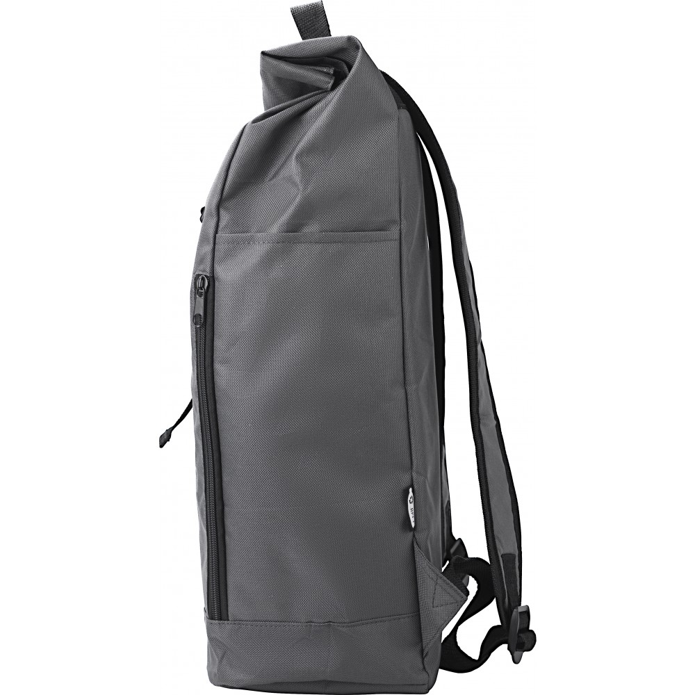 Rolltop hátizsák. Két cipzáras zseb az oldalán, egy nagy rekesz. Tépőzárral és csattal záródik. 600D RPET poliészter.