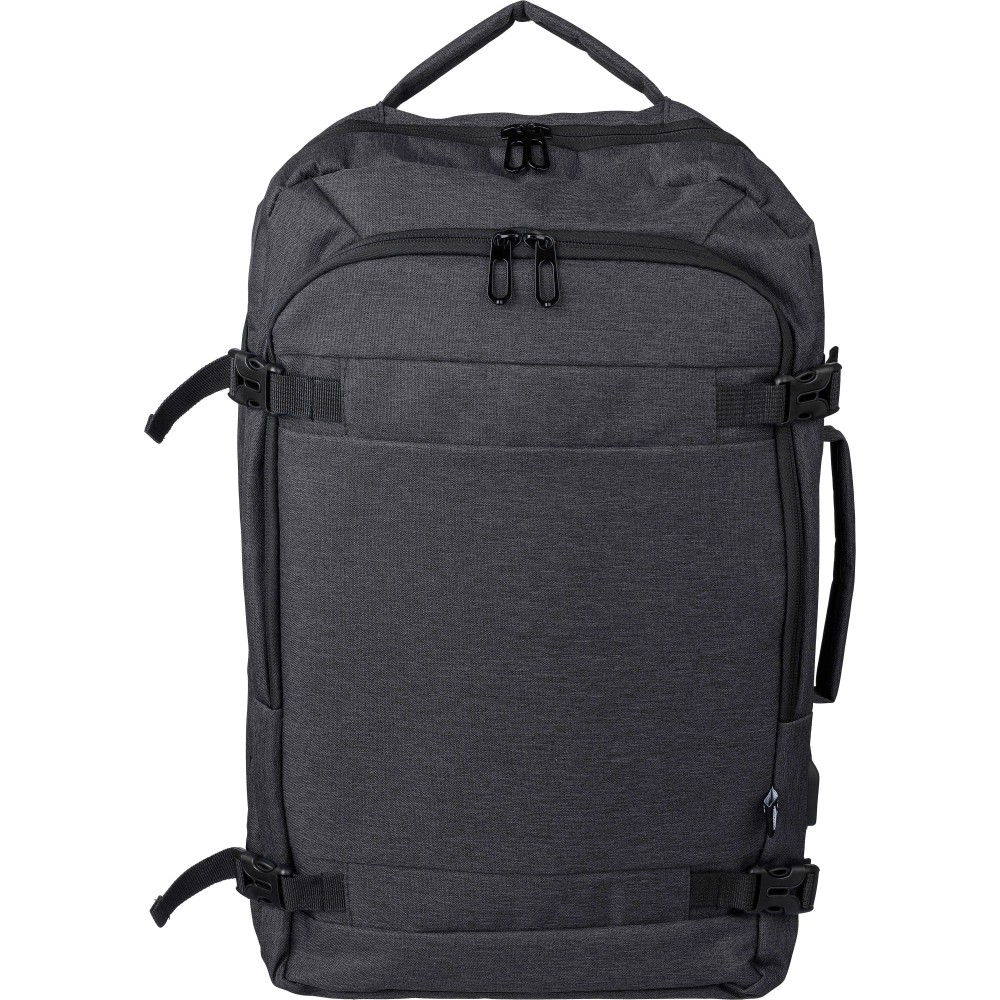 Hátizsák és laptoptáska 17 -es készülékhez. Kézipoggyász méretű. Hordozófüllel a tetején és oldalain. Tépőzáras laptop rekesszel, lopásgátló zsebbel és két nagy cipzáras rekesszel. Szellőző, párnázott hátoldallal, bőröndre húzható pánttal, zárócsatokkal és oldalsó USB-A porttal rendelkezik. Oldalsó csatok segítik a csomag kompakt tartását. Terhelhetősége kb. 12 kg. RPET alapanyagra utaló címke. Anyaga: 300D rPET poliészter.