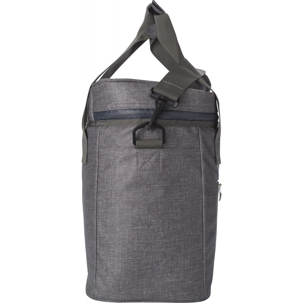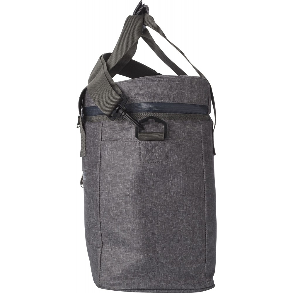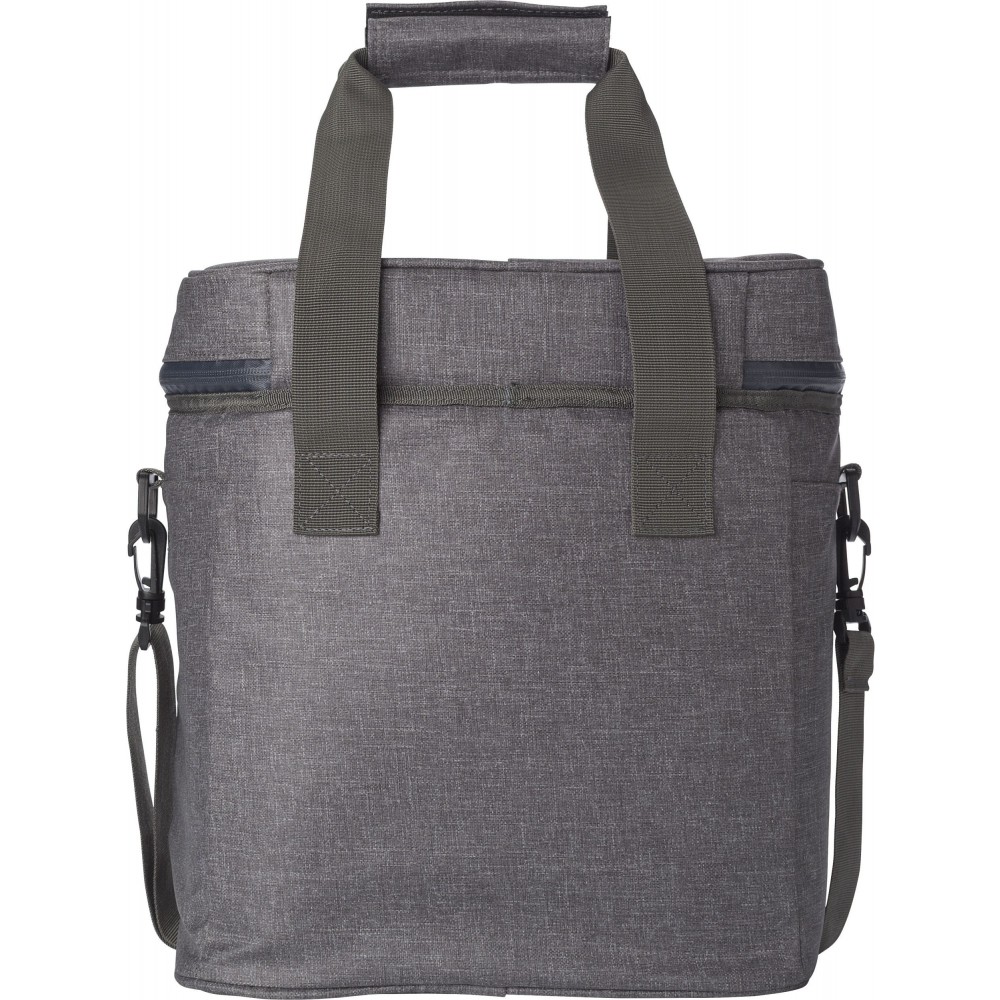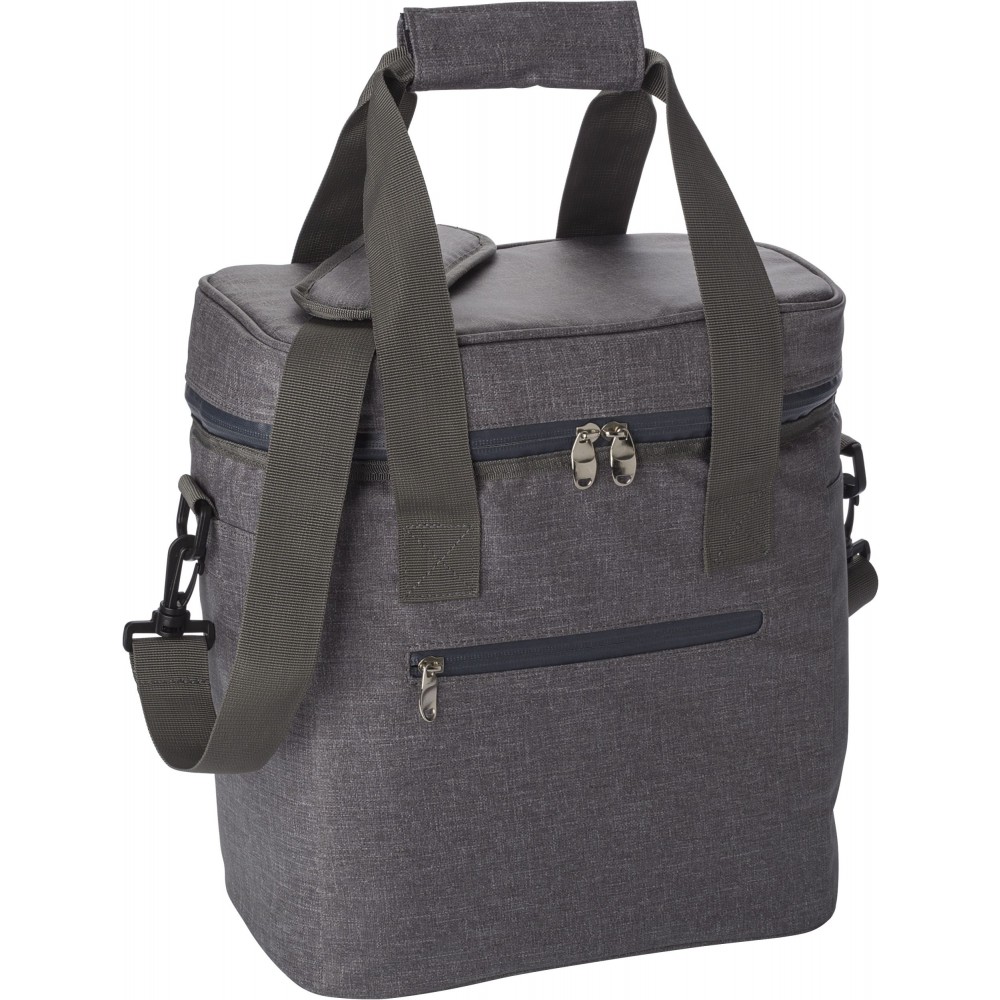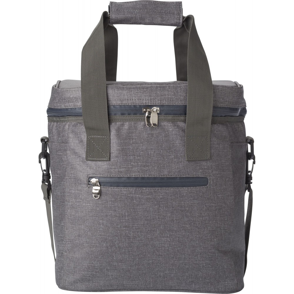 Hűtőtáska egy nagy főrésszel és cipzáros elsőzsebbel, fülekkel, vállpánttal. PE, PU műanyag.