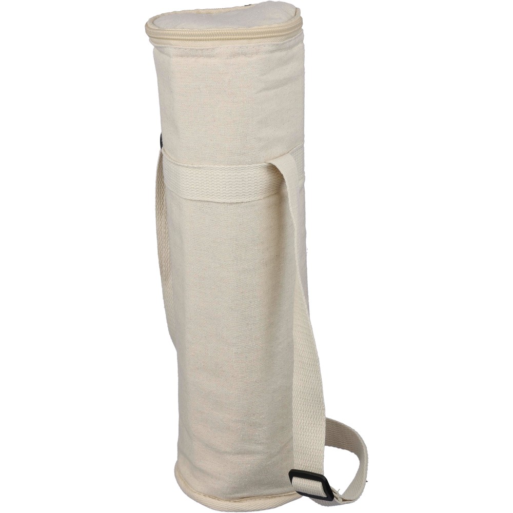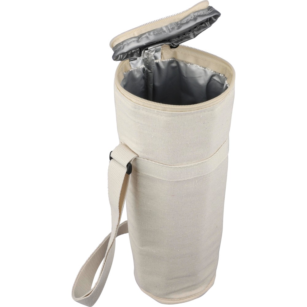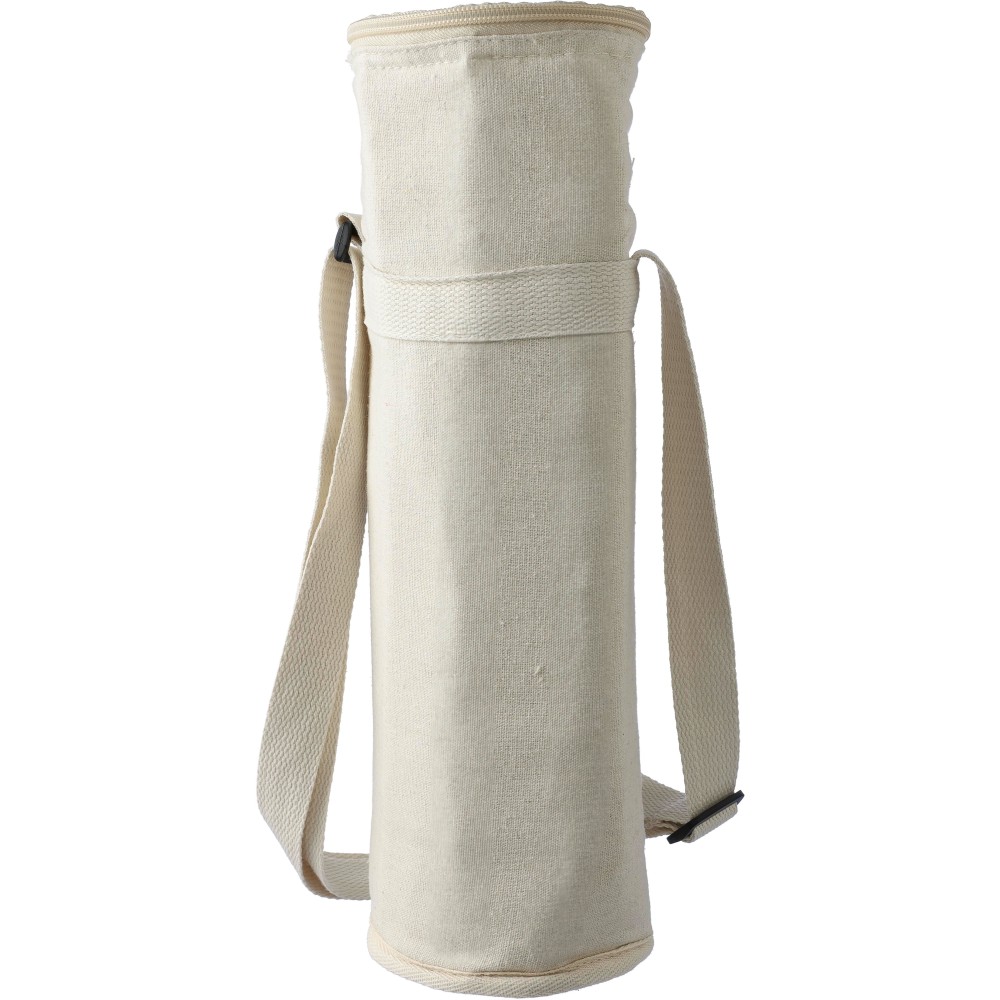Palackhűtő táska cipzáras záródással, belsejében 2 mm EPE és 12C PEVA béléssel. Hosszú, állítható hordozópánttal. Kapacitás: 1,5 literes palack. Az oldalon újrahasznosított pamut anyagra utaló címkével. Anyaga: újrahasznosított pamut 270 g/m2.