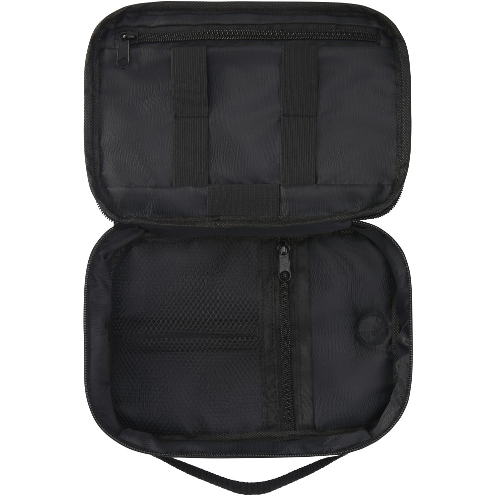 A Ross GRS újrahasznosított tech-táska ideális az állandóan úton lévők számára, és rendezetten tarthatja a powerbankokat, töltőkábeleket vagy bármilyen más elektronikus kiegészítőt. Több zsebbel, elasztikus hurokkal és egy kábelátvezető résszel rendelkezik, amely lehetővé teszi a powerbank tárolását, miközben a telefont tölti. Egy műanyag karabinerrel is rendelkezik egy másik táskához való rögzítéshez. Űrtartalom: 1 liter.