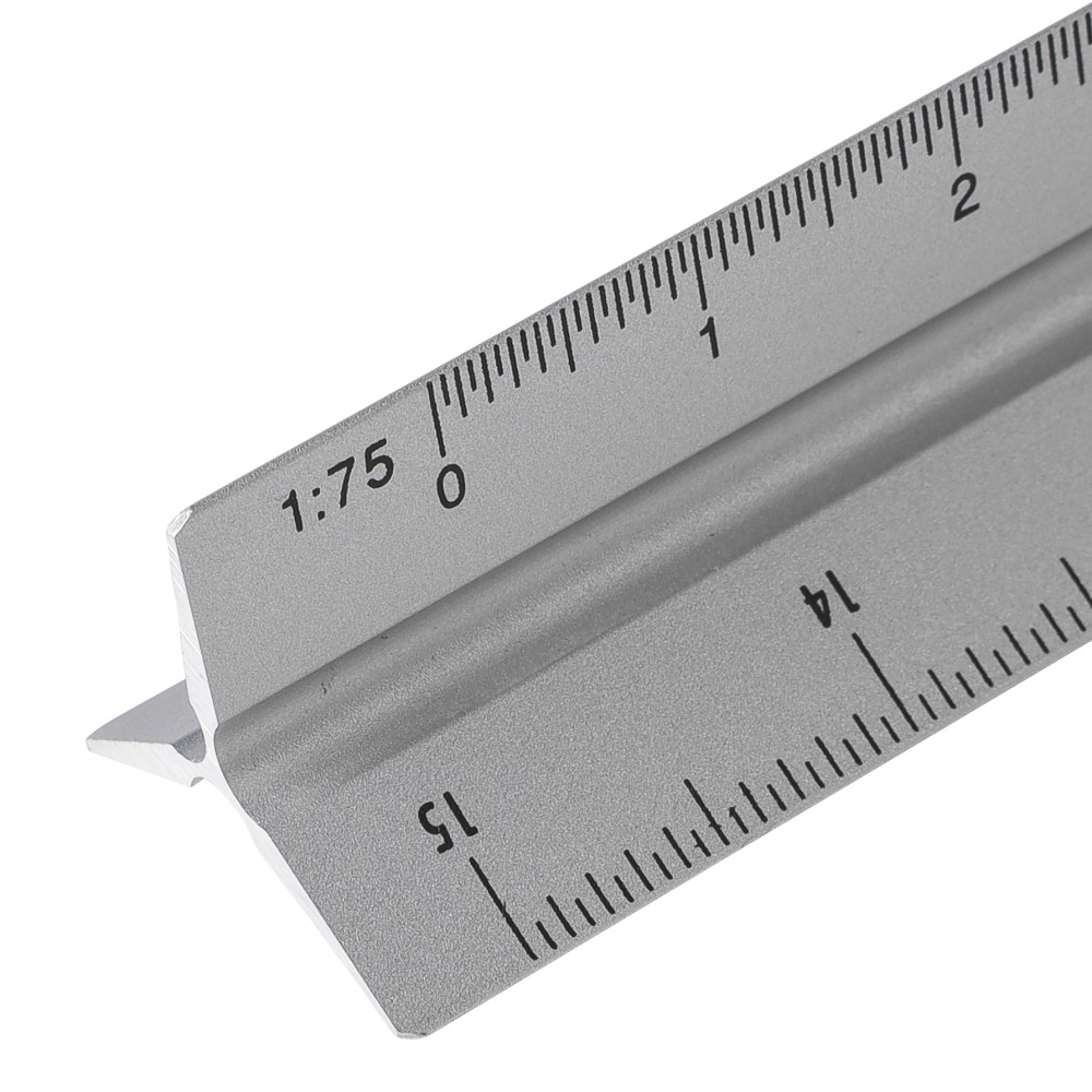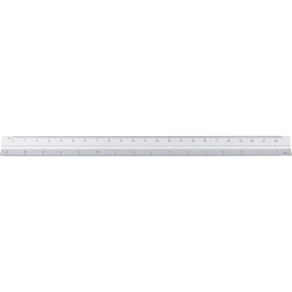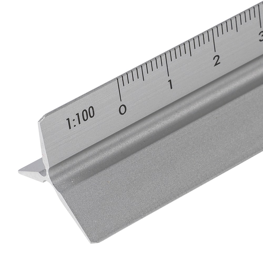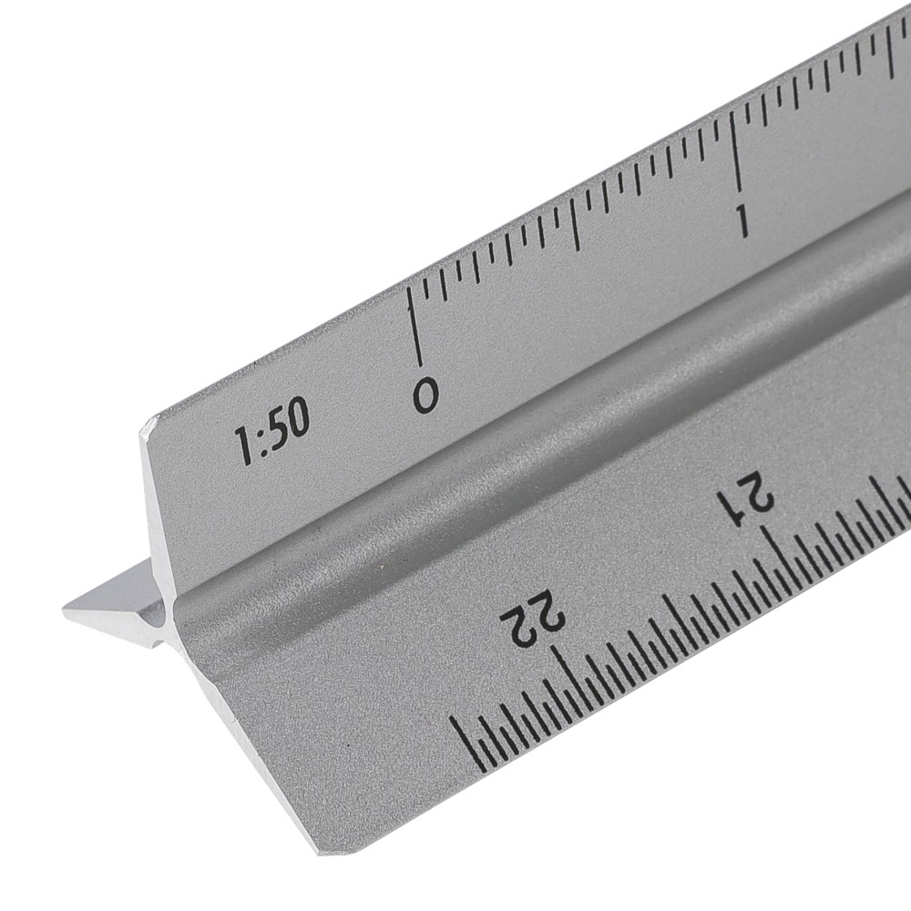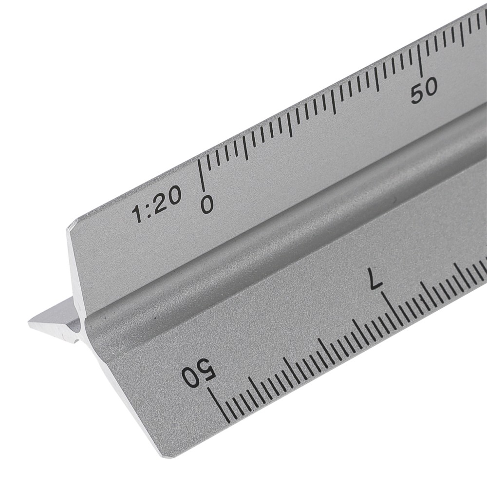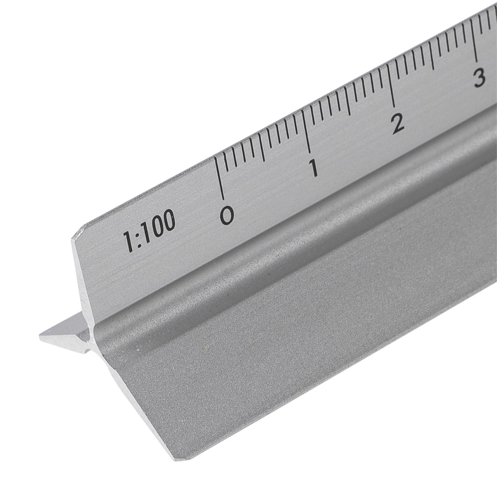 Alumíniumból készült, 30 cm hosszú háromszög alakú vonalzó több mérési léptékkel: 1:20, 1:25, 1:50, 1:75 és 1:100. Az egyik oldala skála nélküli gravírozási felületként használható. Centiméter és inch beosztással ellátva. Darabonként barna kartondobozba csomagolva.