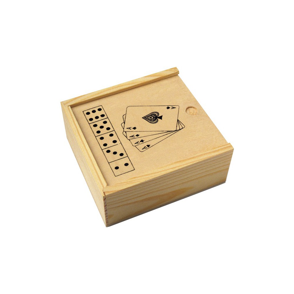 Társasjáték fadobozban. 52 lapos kártyacsomag és 5 db dobókocka.