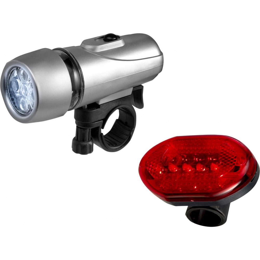 Biciklis lámpaszett. Első lámpa 5 LED fénnyel, 3 villogómóddal. Hátsó lámpa 4 LED fénnyel, 7 villogómóddal. Az elemet tartalmazza.