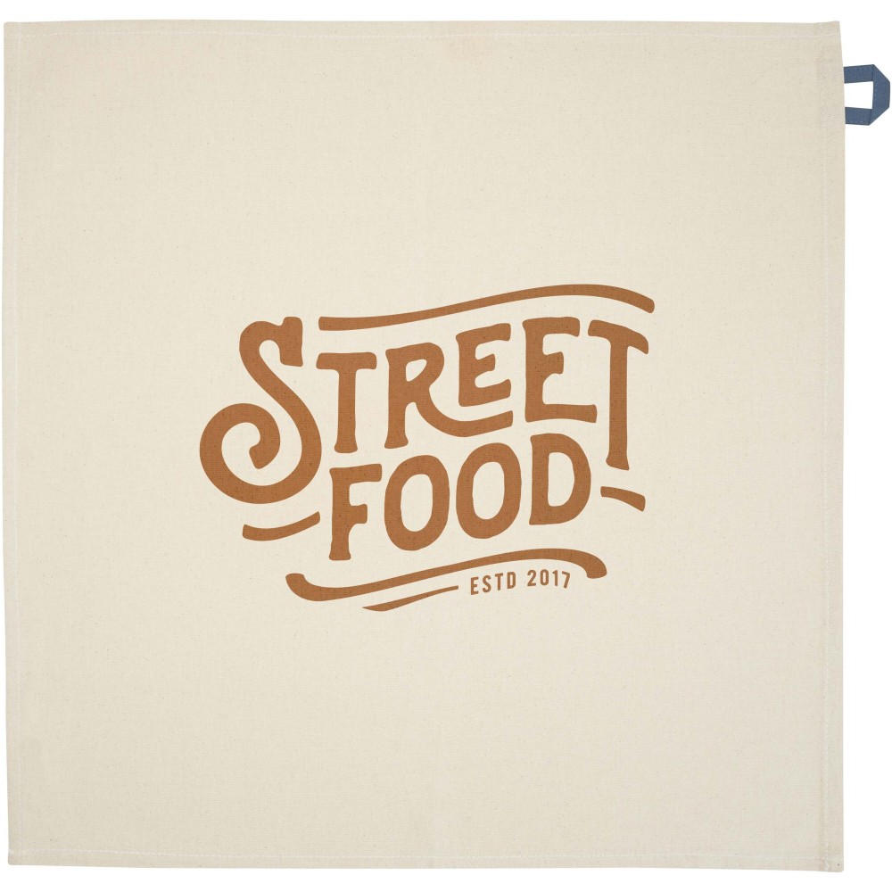 Konyharuha 100% GRS tanúsítvánnyal, 200 g/m2 újrahasznosított pamutból készült, és jellegzetes kontrasztos akasztóval rendelkezik. Mérete: 50 x 50 cm.