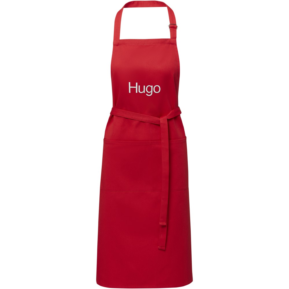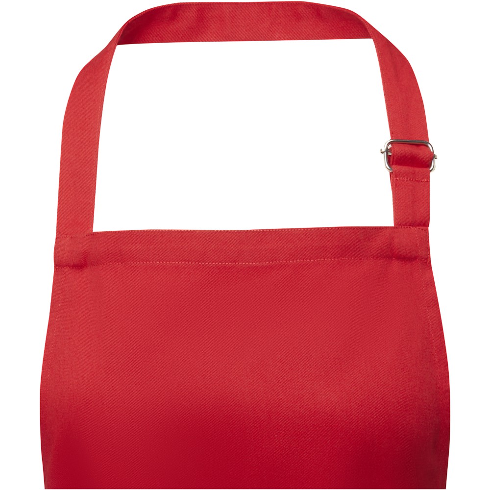Vastag és masszív anyag, ugyanakkor puha és kényelmes viselet. A két elülső zseb gyors és egyszerű módot kínál a konyhai eszközök tárolására. A kötény nyakában csattal állítható, hátul megköthető. Nagyméretű nyomtatási lehetőség a logók megjelenítéséhez. Pamut twill 65% poliészterből és 35% pamutból, 240 g/m2.