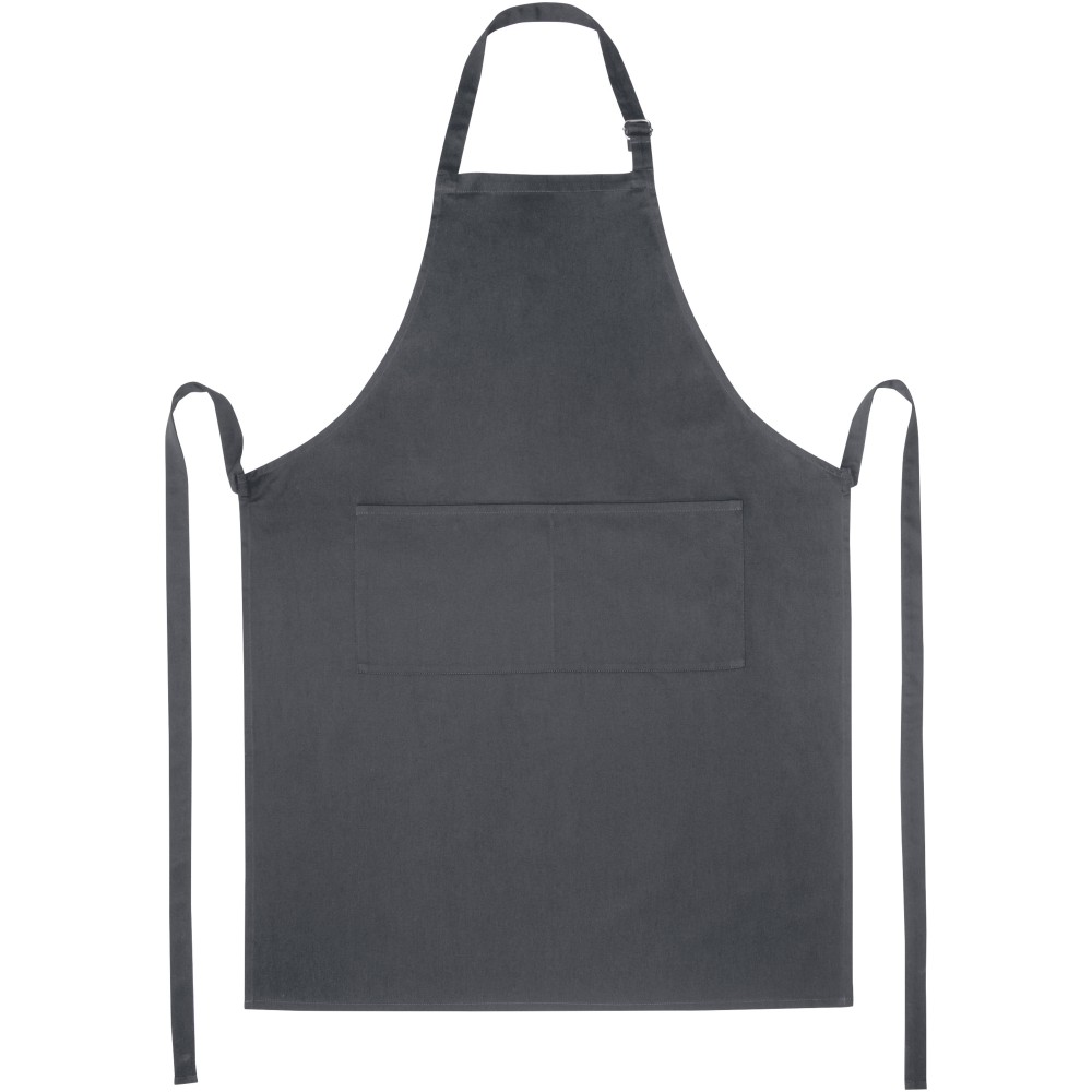 Vastag és masszív anyag, ugyanakkor puha és kényelmes viselet. A két elülső zseb gyors és egyszerű módot kínál a konyhai eszközök tárolására. A kötény nyakában csattal állítható, hátul megköthető. Nagyméretű nyomtatási lehetőség a logók megjelenítéséhez. Pamut twill 65% poliészterből és 35% pamutból, 240 g/m2.