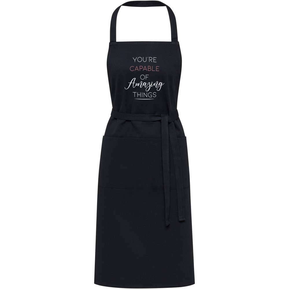 A Shara kötény 70% újrahasznosított pamutból és 30% újrahasznosított poliészterből készült, így vastag, strapabíró és kényelmes viselet. A kötény 2 egymás melletti zsebbel (egyenként 22 x 20 cm) és egy 1 méteres megkötővel rendelkezik. A kötény Cyclo újrahasznosított szálakat tartalmaz, ahol előválogatott hulladékot használnak, amely meghatározza a fonal színét. Minden kötényhez egy Aware nyomjelző is tartozik. Ez az innovatív funkció lehetővé teszi a felhasználók számára, hogy egy QR-kód segítségével nyomon követhessék a termék eredetét és útját, növelve az ellátási lánc átláthatóságát és elősegítve a termék és a gyártási folyamat közötti szorosabb kapcsolatot.