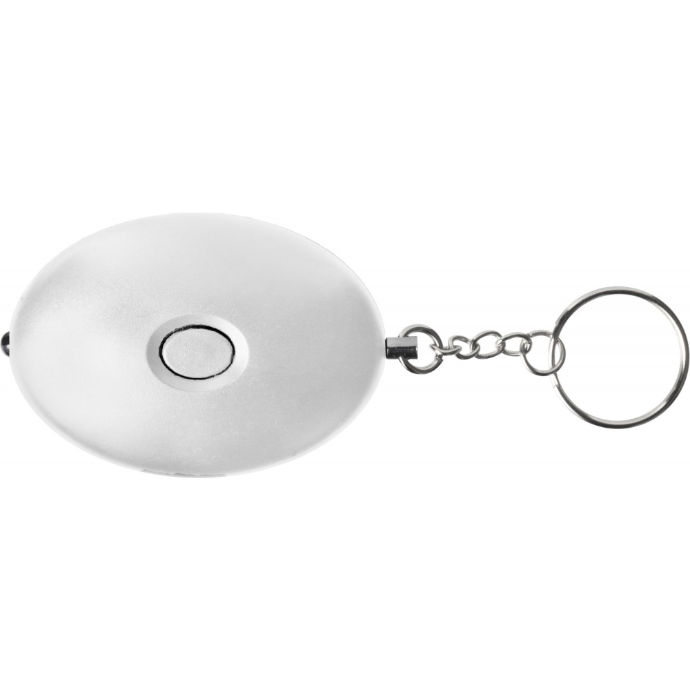 Riasztó kulcstartóval. A LED-lámpa és a riasztó hangja gombbal indítható el. Az elemet tartalmazza. 102 dB-lel szól. ABS műanyag.