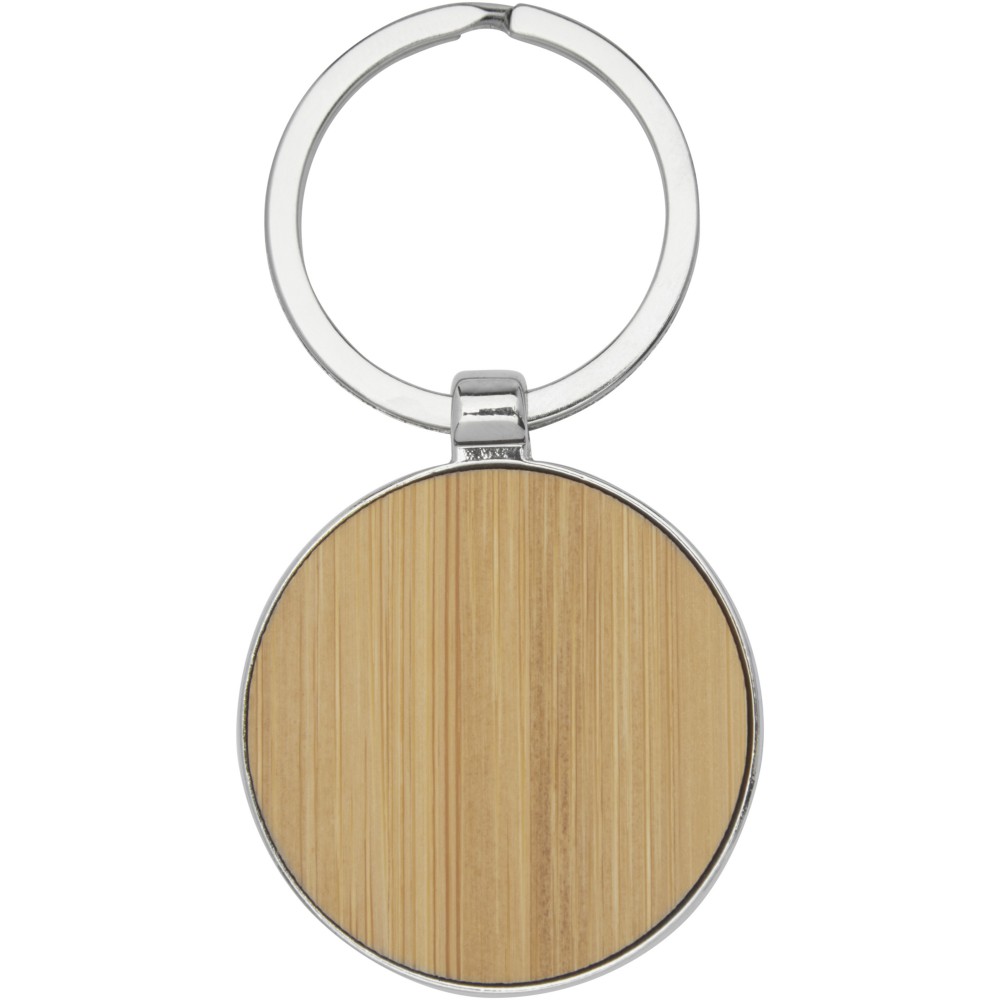 Kerek kulcstartó bambusz és cink ötvözet burkolattal, barna tasakban. Kiválóan lézergravírozható. 90% bambusz és 10% Cinkötvözet. A bambusz felület mérete: d: 4 cm.