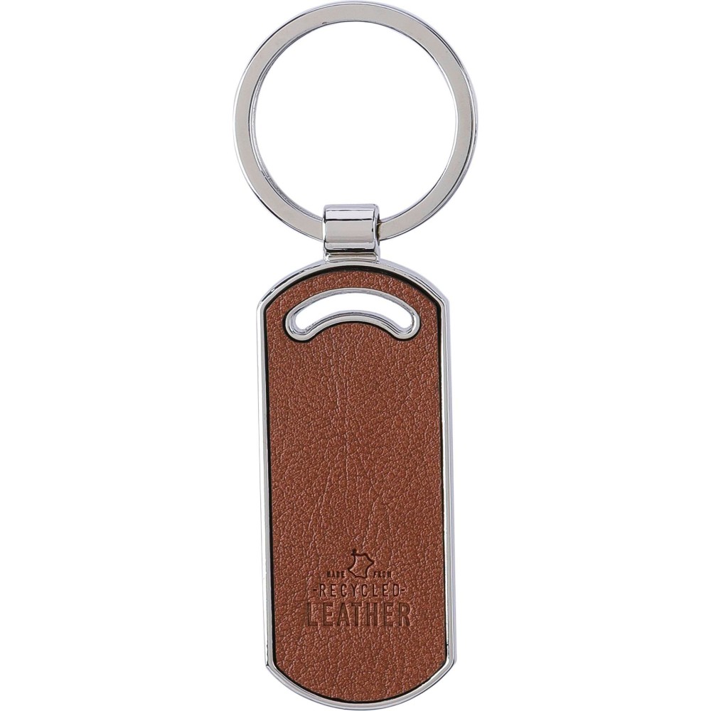 Kulcstartó ovális alakú, újrahasznosított bőrből, fém karikával. Oldalán dombornyomott újrahasznosított bőr anyagra utaló logóval. Egyenként barna kartonhüvelybe csomagolva. Anyaga: újrahasznosított bőr.