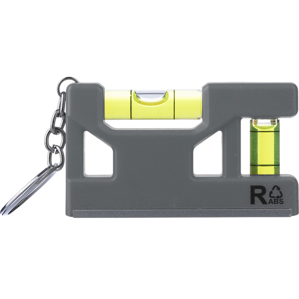 Újrahasznosított ABS-ből készült mágneses kulcstartó vízmértékkel és méretjelzéssel a tetején. Alján mágneses csíkkal fém felületekre való rögzítéshez. Kulcskarikát és újrahasznosított ABS logót tartalmaz a hátoldalán. Egyenként csomagolva, barna kartondobozban.