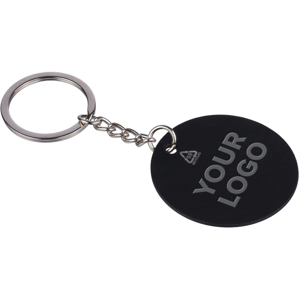 Újrahasznosított rozsdamentes acélból készült, gumírozott felületű, kerek kulcstartó fém karikával. A kulcstartón gravírozott recycled (újrahasznosított) alapanyagra utaló logó található, amely gravírozás után fényes, tükörszerű hatást mutat. Egyenként kraft papírtasakba csomagolva.