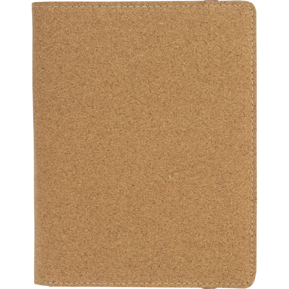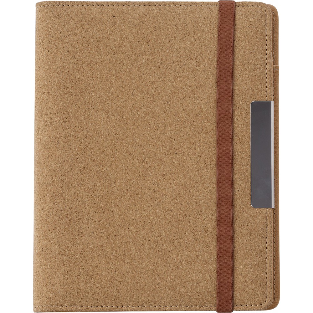 A5-ös méretű parafa mappa gumis zárópánttal, PU belsővel, kicsi hálós névjegytartó zsebbel, egy nagyobb zsebbel, 20 lapos jegyzettömbbel és tolltartó füllel (a tollat nem tartalmazza).