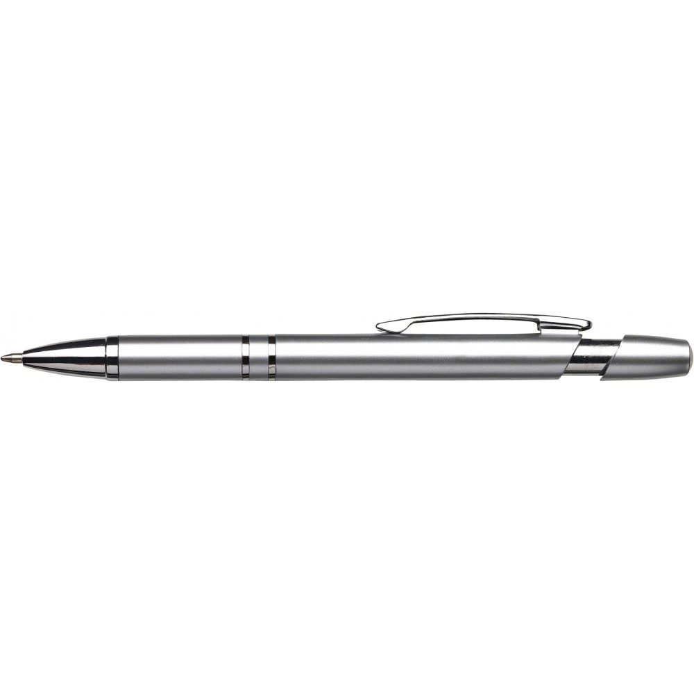 Műanyag golyóstoll metálos fényű tolltesttel, króm kiegészítőkkel, kék tollbetéttel.