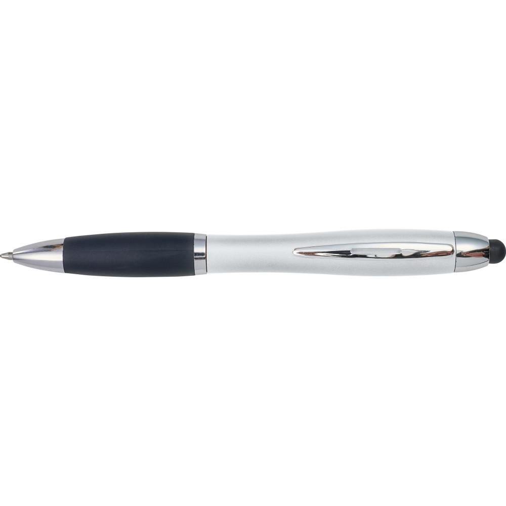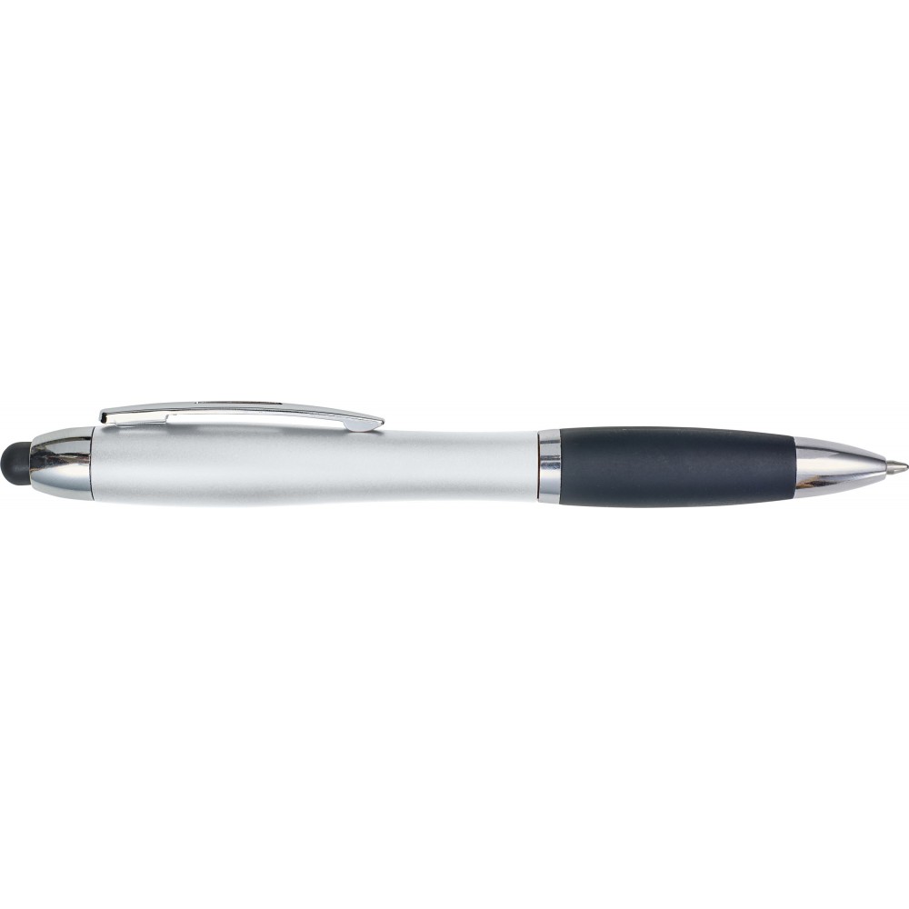 Golyóstoll lámpával, fekete gumis fogórésszel, krómozott kiegészítőkkel, kék tollbetéttel. A lézergravírozott logó világít a lámpának köszönhetően. ABS műanyag.
