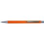 Golyóstoll gumis bevonattal, kék tollbetéttel. A hegy, klipsz és a nyomógomb egyforma sötétszürke színű. ABS, alumínium.