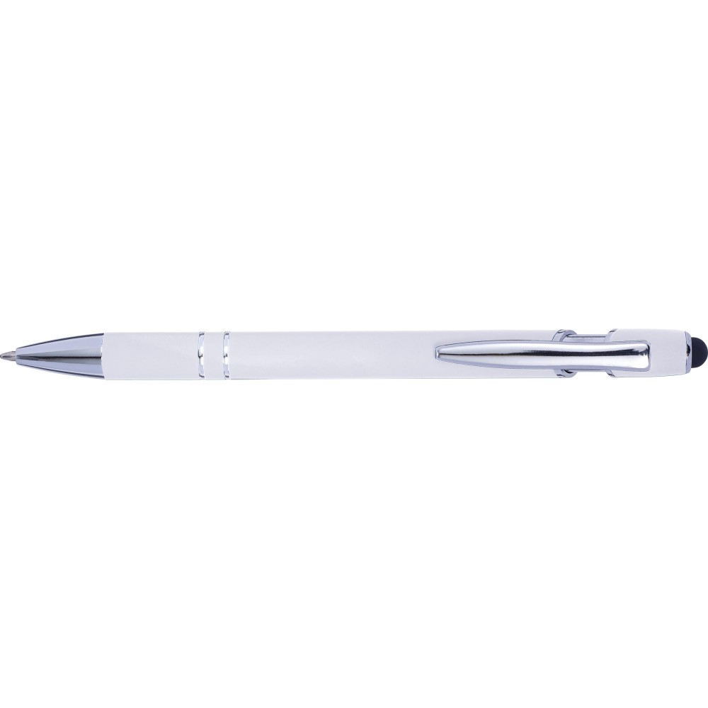 Golyóstoll kék tollbetéttel, gumis felülettel és érintővel kapacitív képernyőkhöz. Kék tollbetéttel. A hegy és a klipsz ezüst színű műanyag. ABS, alumínium.