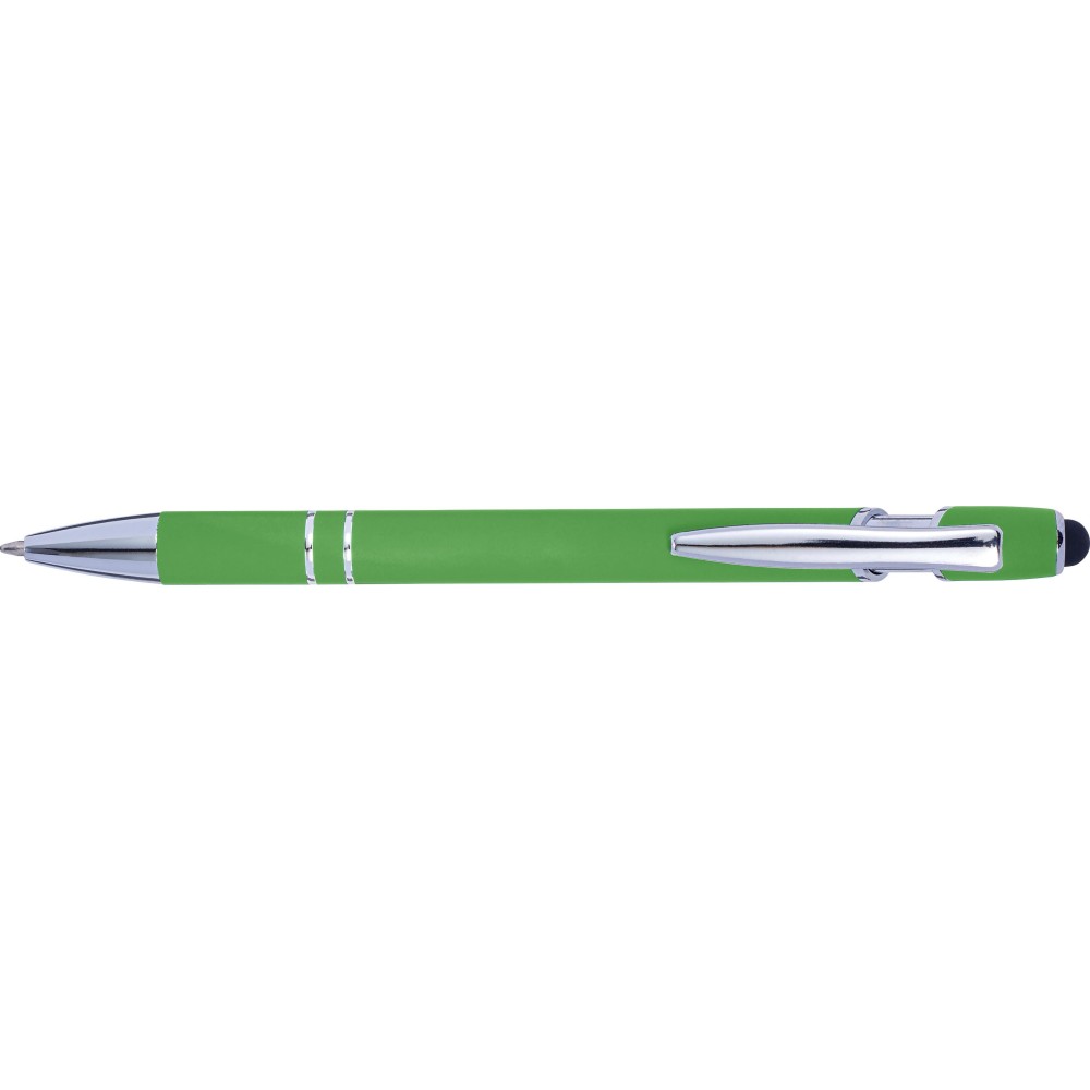 Golyóstoll kék tollbetéttel, gumis felülettel és érintővel kapacitív képernyőkhöz. Kék tollbetéttel. A hegy és a klipsz ezüst színű műanyag. ABS, alumínium.