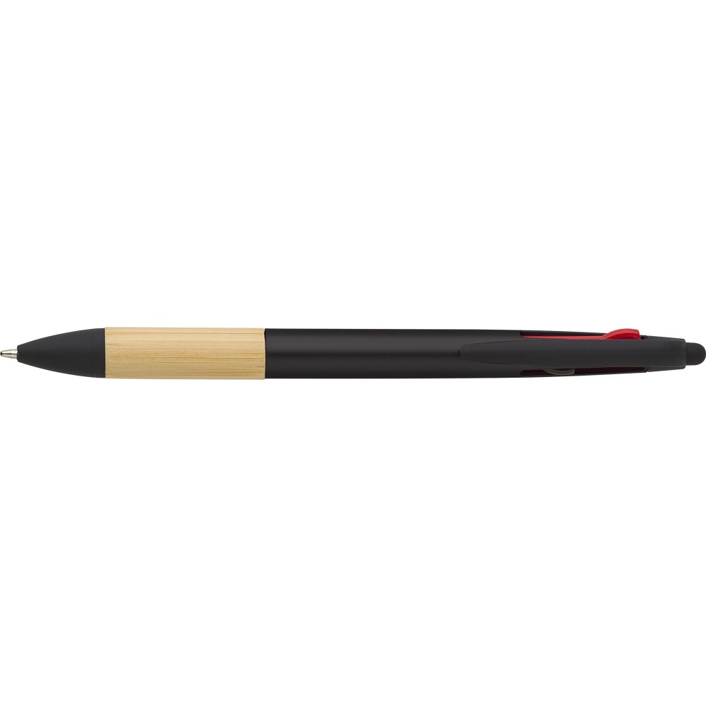 Golyóstoll 3 féle tollbetéttel, bambusz markolattal és tollheggyel. A tollbetét színei: piros, kék, fekete. ABS műanyag.