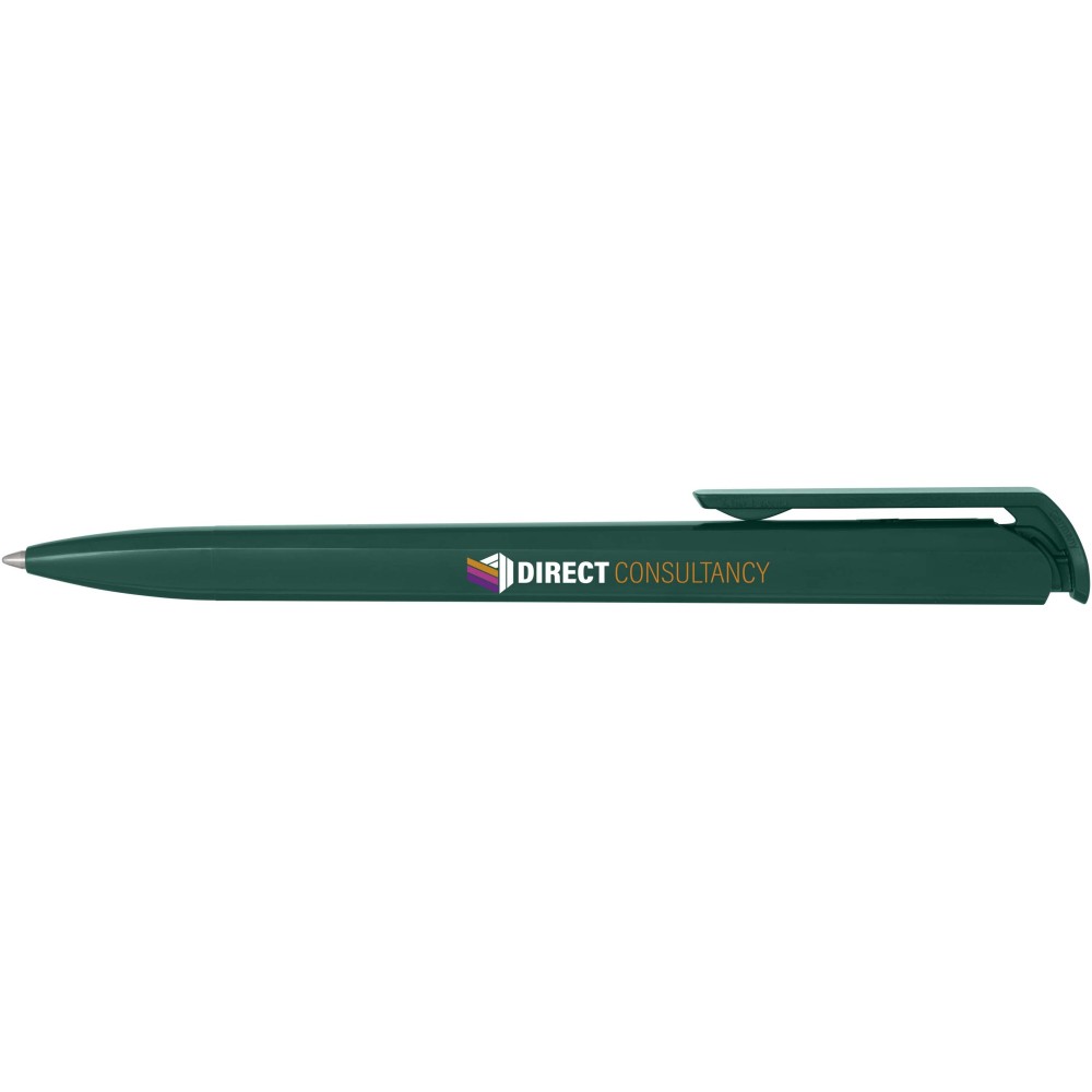 Golyóstoll, amelynek teste és klipsze újrahasznosított műanyagból készült, a hegy pedig rozsdamentes acélból. Fekete tollbetéttel. Íráshossz: 3000 méter. Hegyméret: 1,00 mm. Németországban készült.