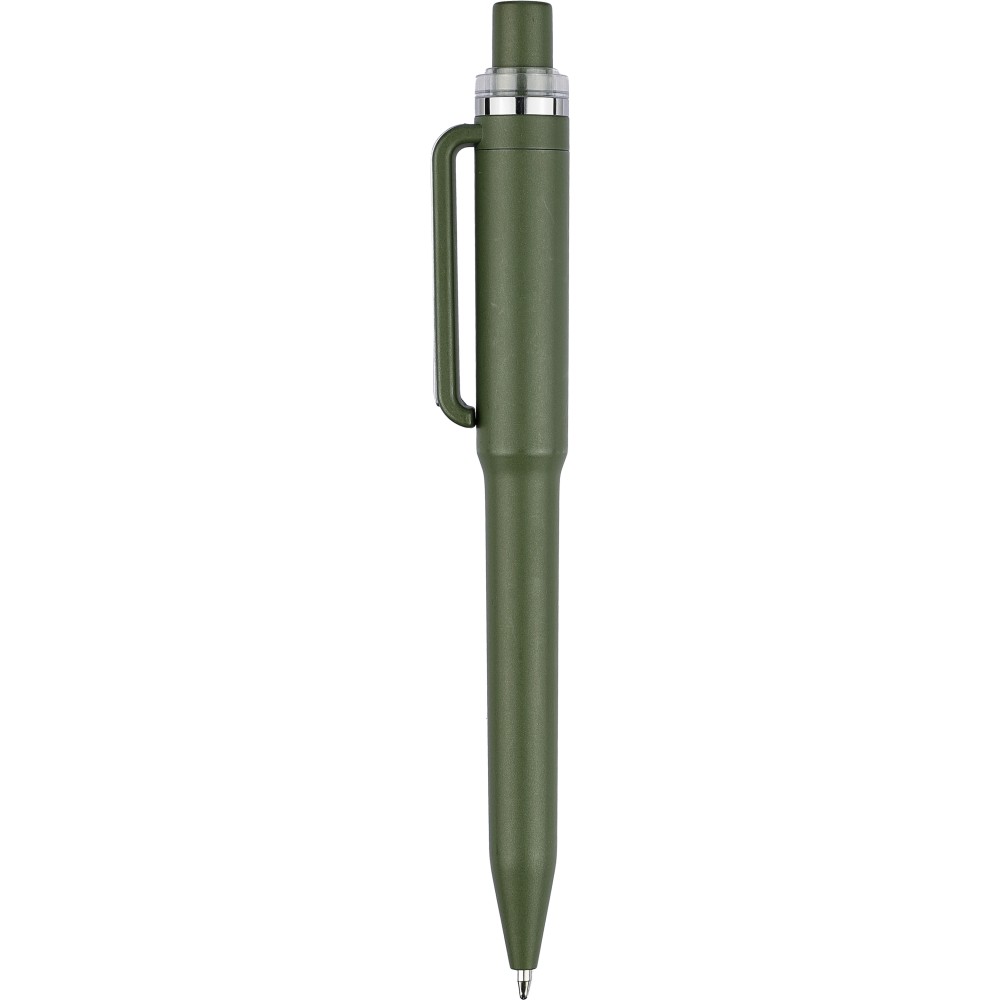 Utazóbögrére emlékeztető formájú golyóstoll fémhatású bevonattal. 800 m íráshosszúságú kék tollbetéttel, műanyag nyomógombbal, klipsszel és a tetején krómozott műanyaggyűrűvel. Újrahasznosított ABS logó a tolltesten. Anyaga újrahasznosított ABS.