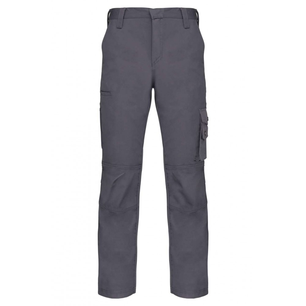 65% poliészter és 35% pamut. Cipzáras és gombos slicc, 3 első zseb, 3 hátsózseb és egy oldalzseb.Szabott térdkialakítás a nagyobb mozgástér érdekében. Iparilag 60 °C-on mosható, házilag 40 °C-on mosható. 255 g/m2. 38-58 méretig.