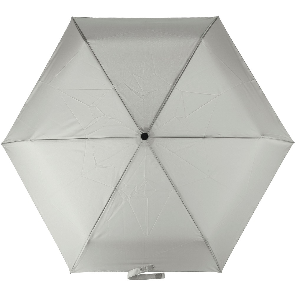 Összecsukható, automata esernyő (21 inch), hat panellel és acél vázzal. Az esernyő tépőzáras záródásán RPET címke található, műanyag karabineres fogantyúval, tokkal. Szélálló. Anyaga: RPET 190T.