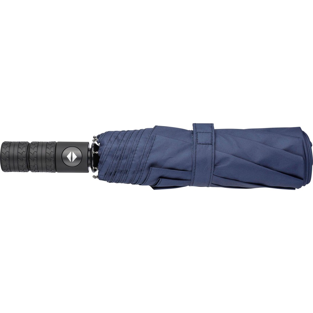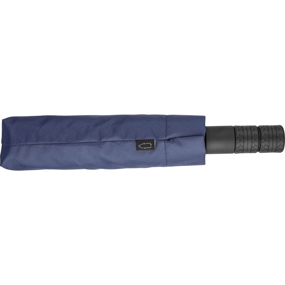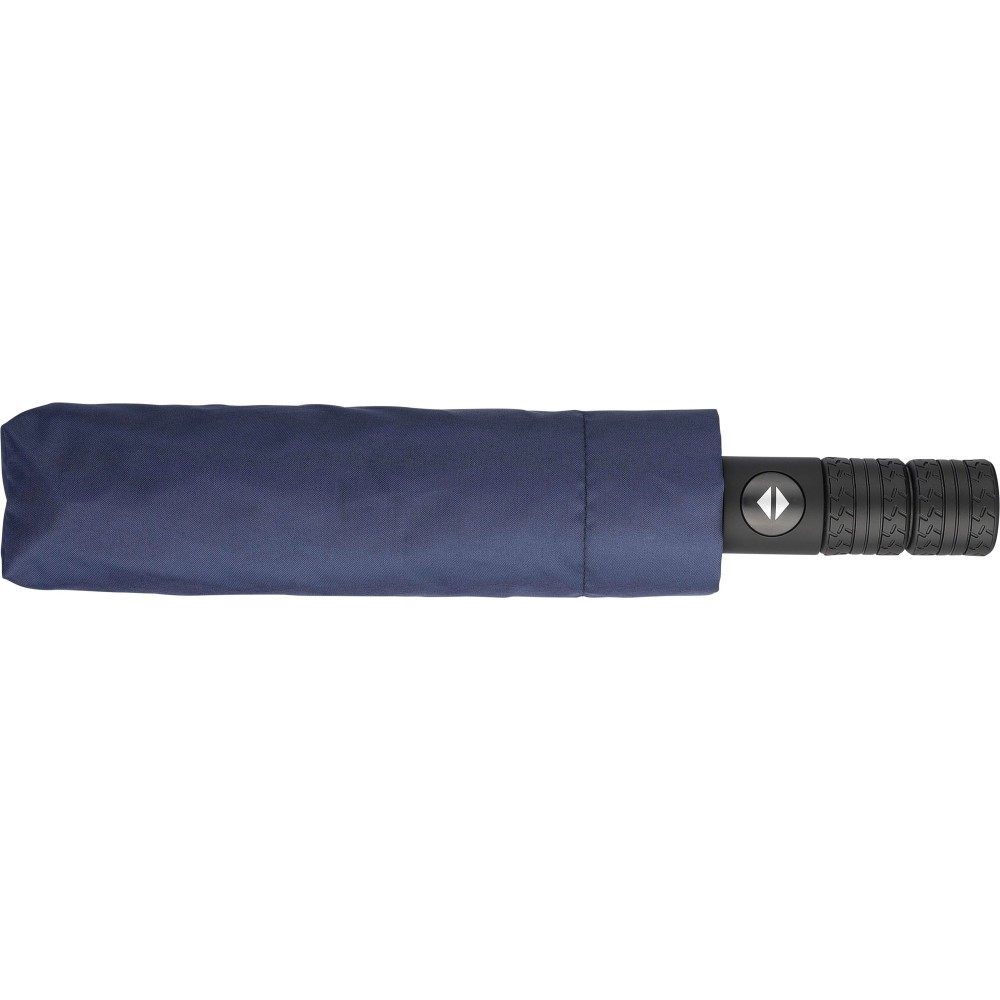Automata nyitású és zárású, összecsukható esernyő 8 panellel, tokkal. Nyele gumis mintázatú, az autók abroncsára emlékeztet. Vászna RPET pongee anyag. Mérete: 21 .