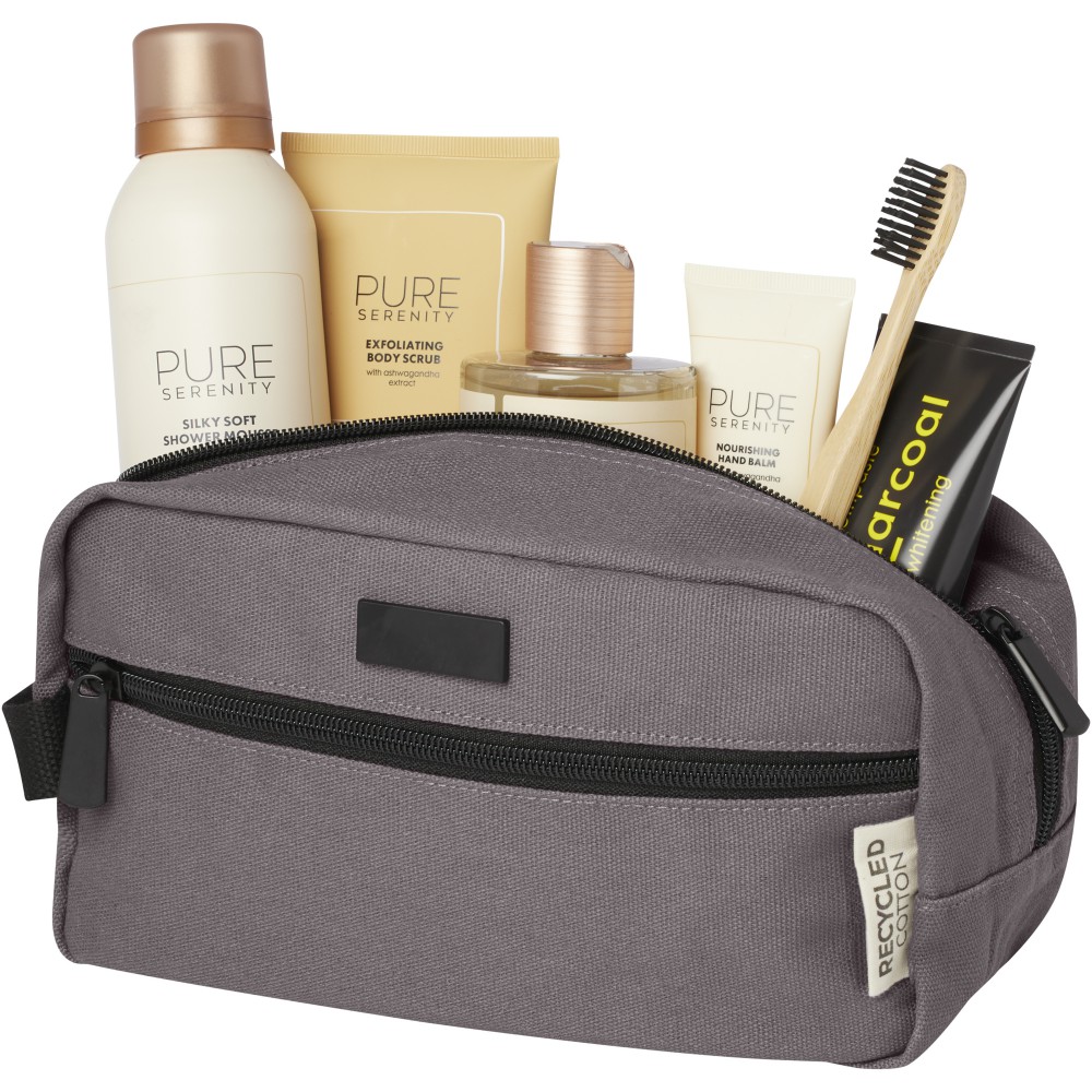 GRS tanúsítvánnyal rendelkező újrahasznosított vászonból és GRS tanúsítvánnyal rendelkező RPET béléssel készült piperetáska. Egy cipzáras elülső zsebbel és egy cipzáras főrekesszel, szervezőzsebekkel és pánttal rendelkezik. Fémlapja gravírozható. Űrtartalom: 3,5 liter.