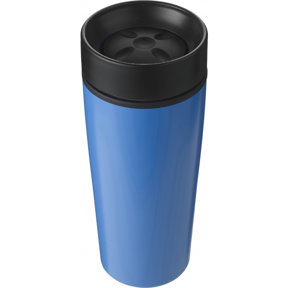 Rozsdamentes acél duplafalú bögre műanyag betéttel, fehér ajándékdobozban. Nem szivárgásmentes. Mosogatógépben nem tisztítható. 450 ml.