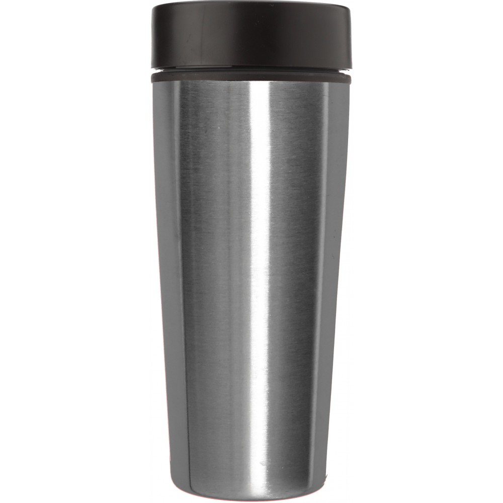 Rozsdamentes acél duplafalú bögre műanyag betéttel, fehér ajándékdobozban. Nem szivárgásmentes. Mosogatógépben nem tisztítható. 450 ml.