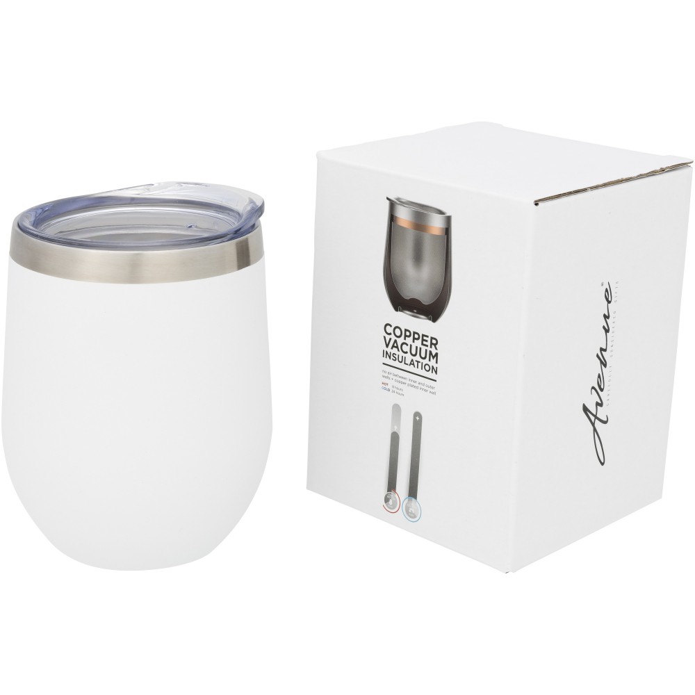 Rozsdamentes, rézbetétes szigetelésű, duplafalú vákumos pohár csavaros fedéllel. Kialakításának köszönhetően a páralecsapódás nem alakul ki. Hőtartóképesség 8 óra, hidegtartó képesség 24 óra. Nem szivárgásmentes. Szénsavas italokkal is használható. Mosogatógépben nem mosható és mikrohullámú sütőben történő melegítésre nem alkalmas. Űrtartalom: 350 ml. Csomagolása Avenue ajándékdoboz. Rozsdamentes acél.