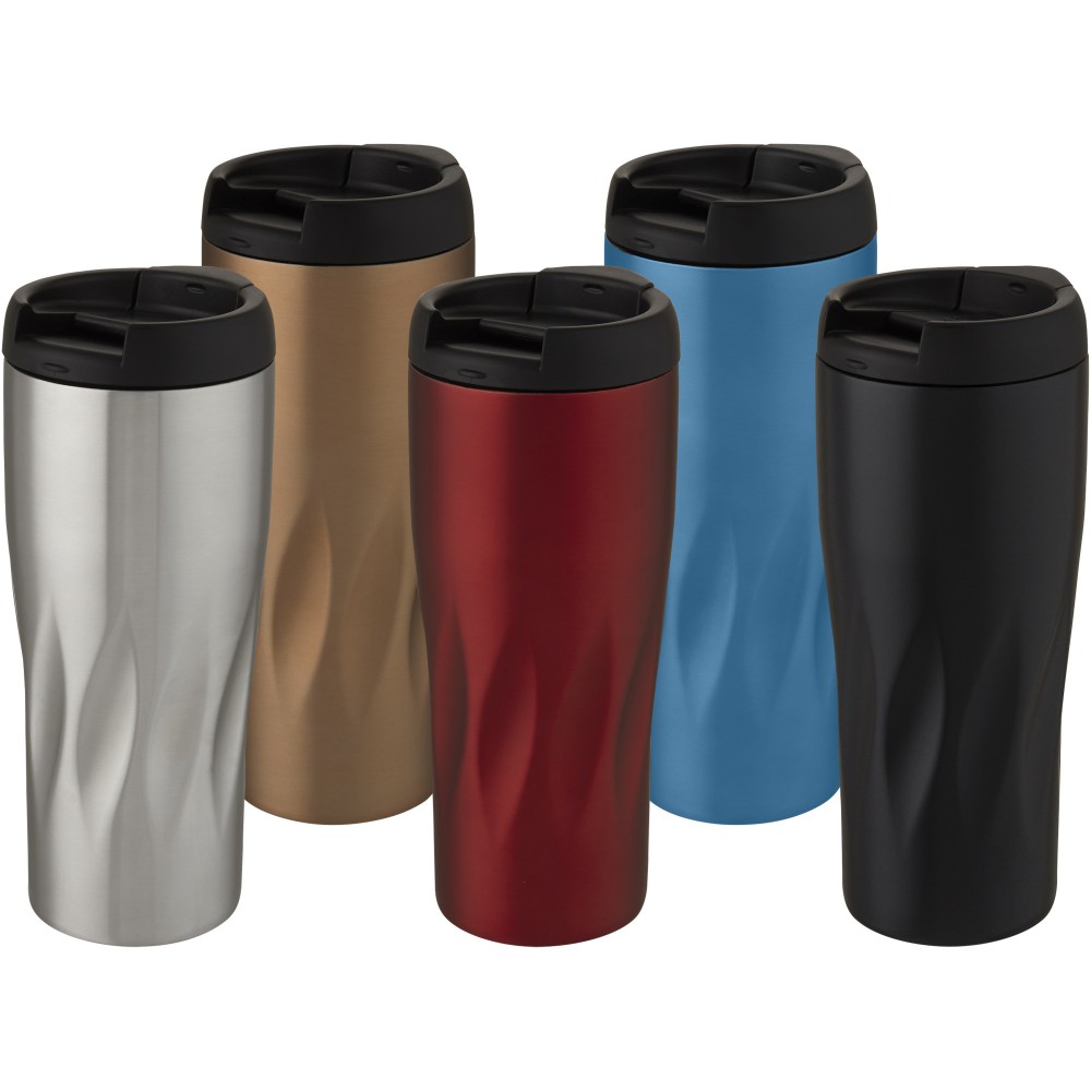 Duplafalú réz vákuumszigetelt pohár csavaros, szivárgásmentes fedéllel, hullámos geometriai kialakítással. A szigetelt 18/8-as rozsdamentes acél több órán keresztül melegen vagy hidegen tartja az italokat. BPA-mentes, a német élelmiszerbiztonsági törvény (LFGB) szerint tesztelt és jóváhagyott, és a REACH előírásai szerint ftaláttartalomra tesztelve. Űrtartalma 450 ml. Kézi mosogatása ajánlott. Újrahasznosított karton díszdobozban.