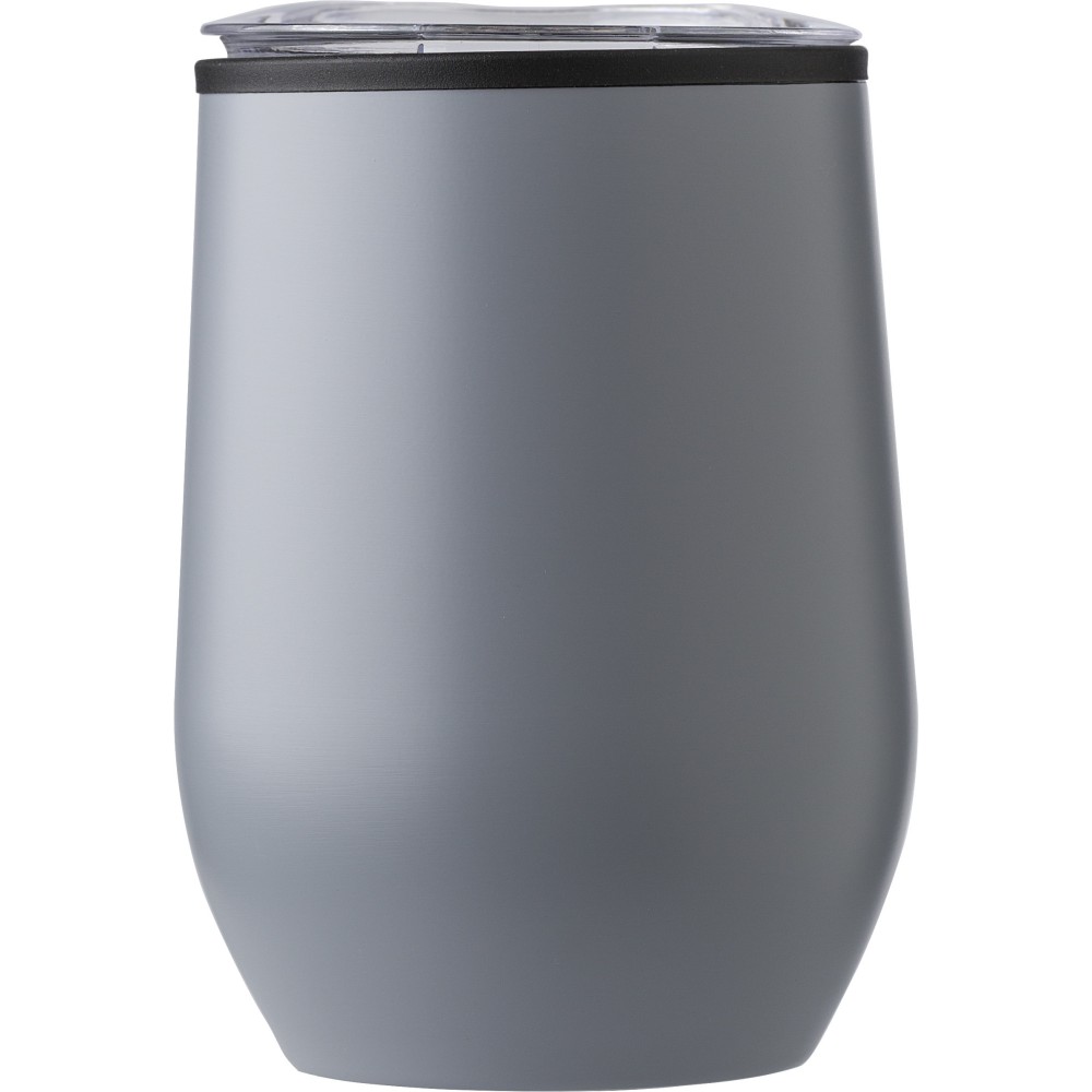 Rozsdamentes acél utazópohár PP belsővel és PS tetővel. A bögre matt felületű. Barna kartondobozba egyedileg csomagolva. Űrtartalom: 300 ml.
