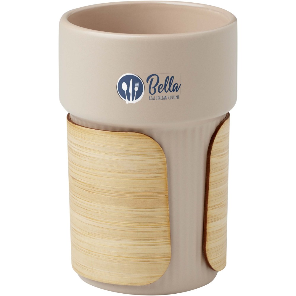 A stílusos Fiko kerámia pohár levehető bambusz burkolattal rendelkezik, amely ideális forró italok fogyasztásához. A bambusz fenntartható, környezetbarát és társadalmilag felelős forrásból származik. Űrtartalom: 340 ml. Újrahasznosított kartondobozban szállítjuk.
