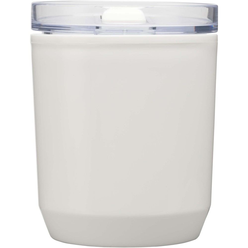 Egyszerű kialakítású termoszbögre, amely a legtöbb kávégéppel és autós pohártartóval kompatibilis. Dupla falú szerkezettel rendelkezik, újrahasznosított PP műanyag külsővel és PP műanyag belsővel. A csúsztatható fedél AS és PP műanyagból készült. Űrtartalma: 180 ml.