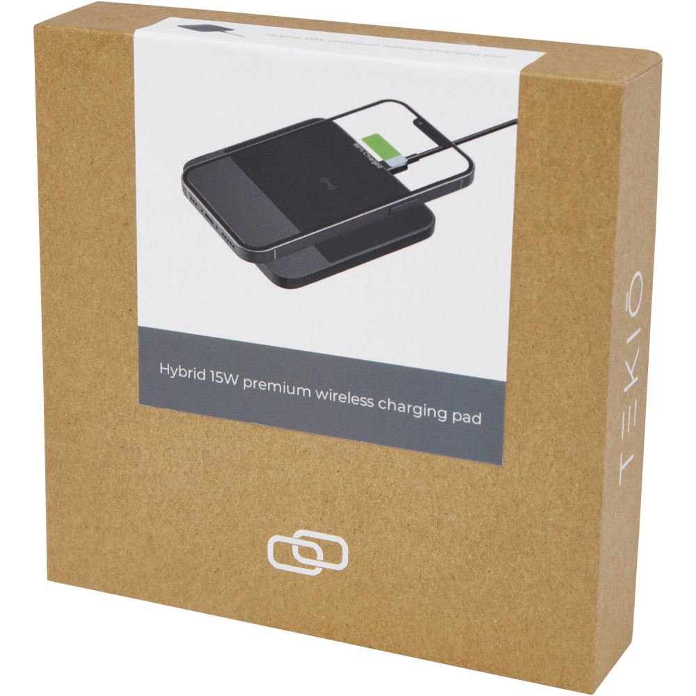 A Hybrid 15 W-os prémium vezeték nélküli töltőpad. Ultravékony kialakításának köszönhetően könnyen elfér a laptoptáska zsebében. Tartós alumínium házból, csúszásgátló TPU bőr töltőpárnával kombinálva. Az akár 15 W-os vezeték nélküli töltési kimenetnek köszönhetően az eszközök gyorsan teljes áramellátást kapnak. Kompatibilis az összes Qi eszközzel (iPhone 8 vagy újabb, valamint a vezeték nélküli töltést támogató Android készülékekkel). Beépített FOD (Foreign Object Detection) funkcióval rendelkezik a nem kívánt tárgyak azonosítására és a zökkenőmentes töltési folyamat biztosítására. Prémium nátronpapír dobozban, színes matricával szállítjuk. C típusú töltőkábel jár hozzá.