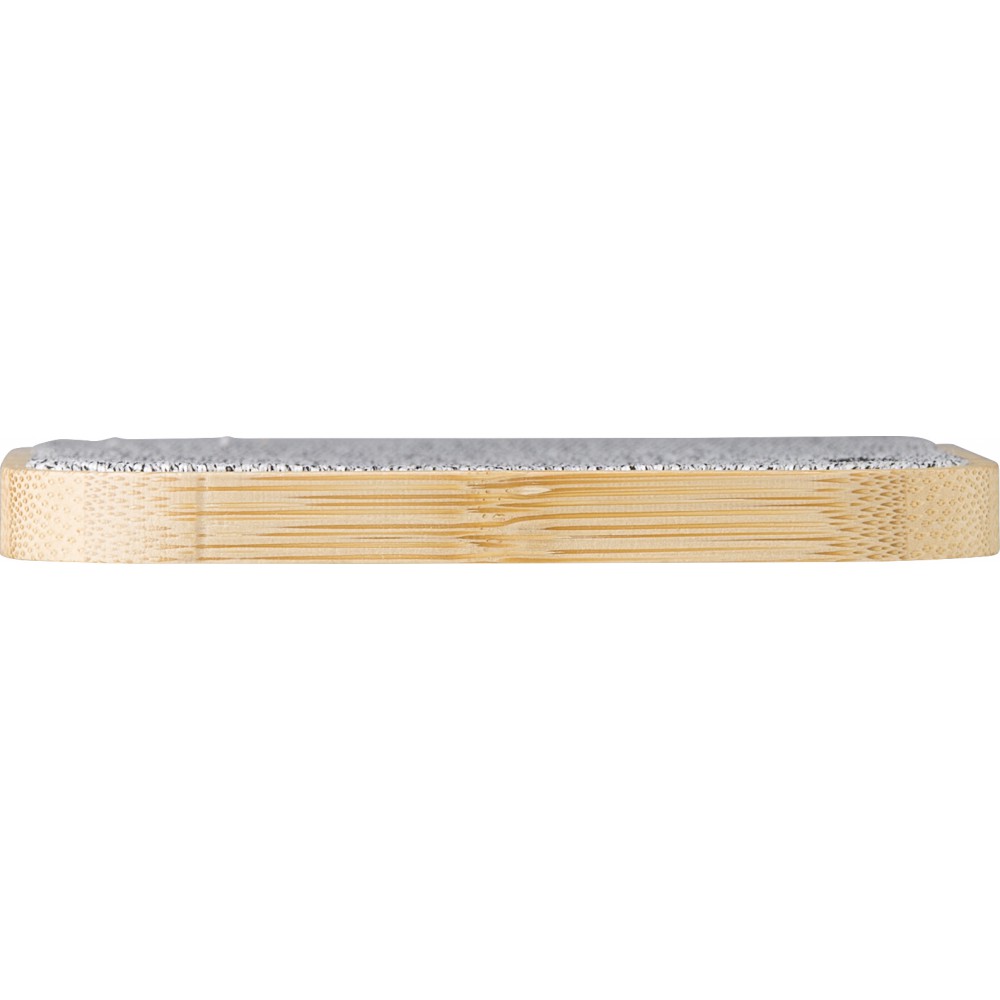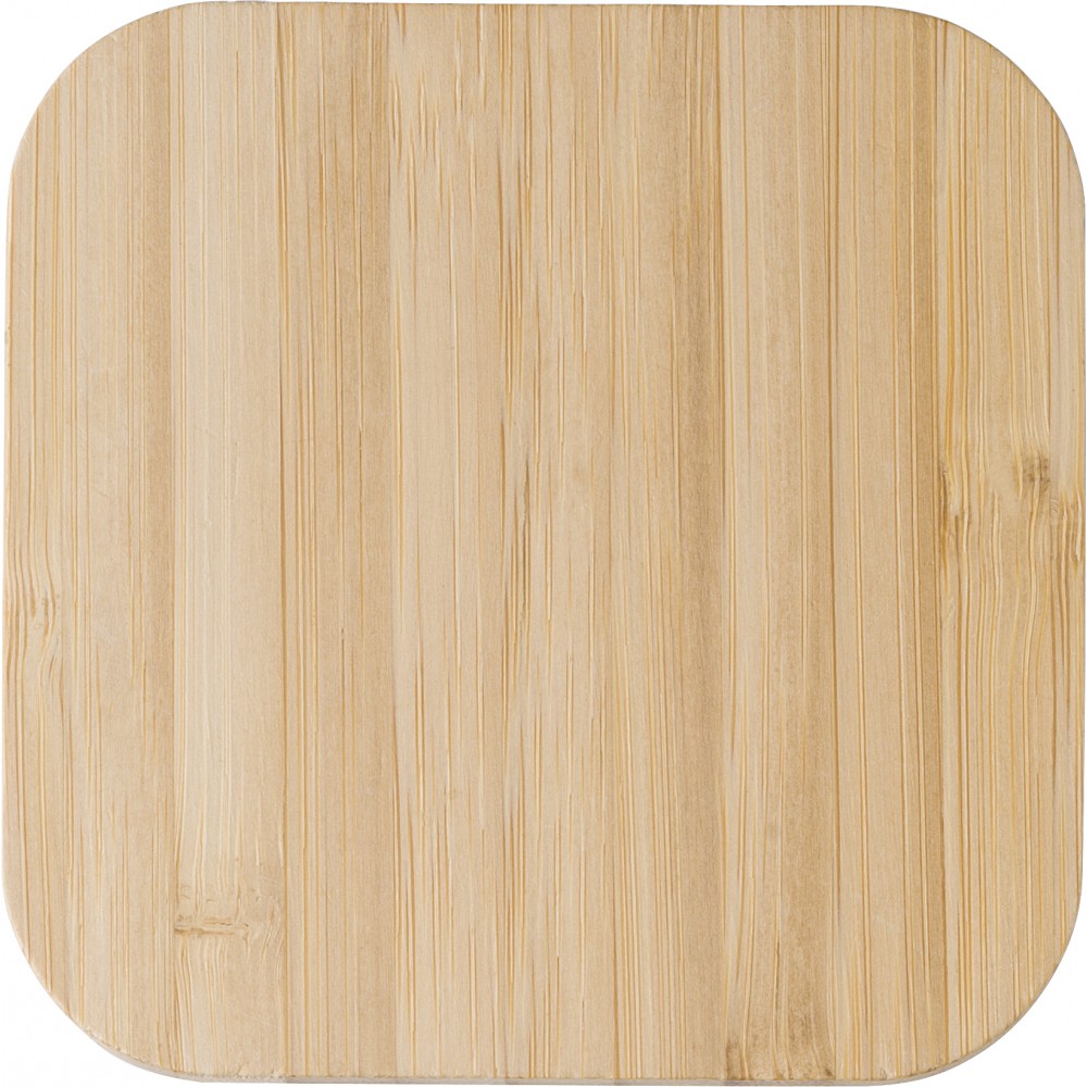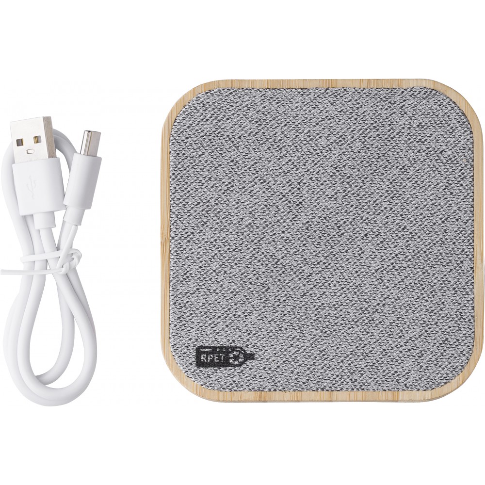 15W-os vezeték nélküli gyorstöltő RPET és bambusz anyagból. Csomagolása barna kartondoboz.