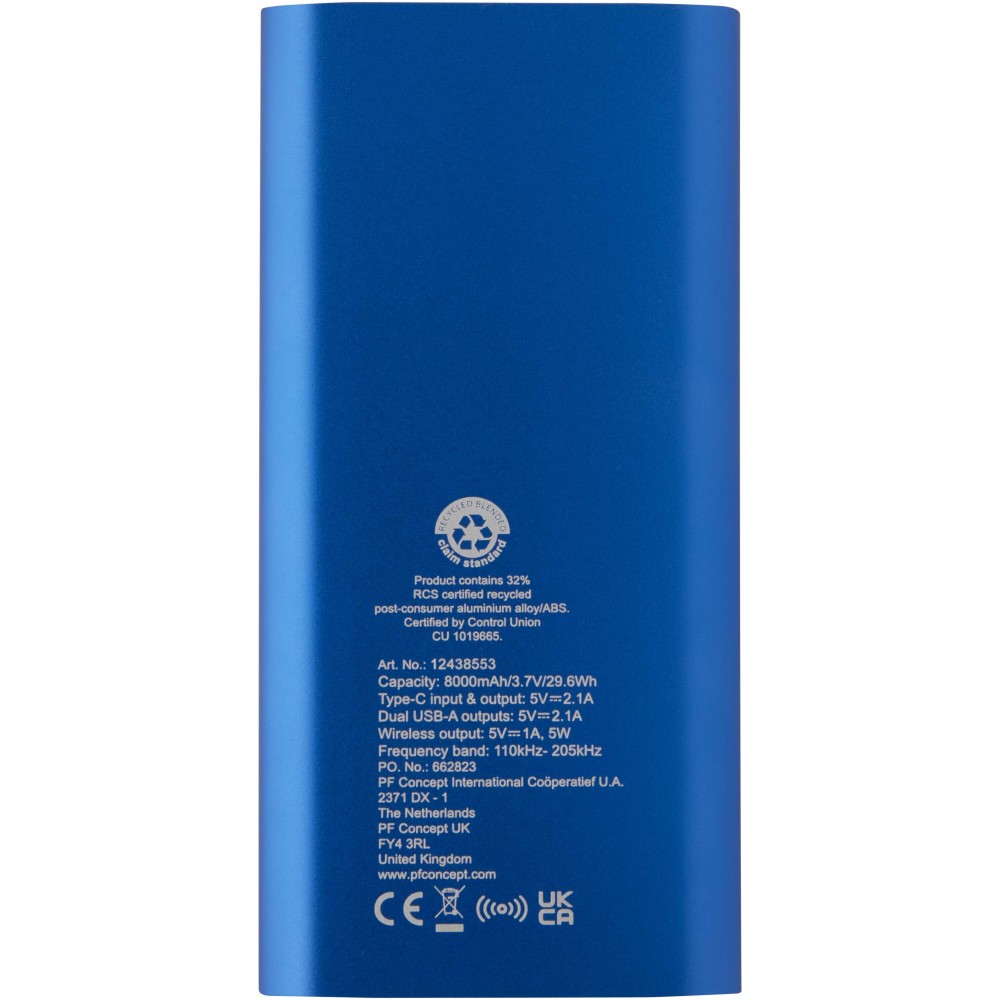 Powerbank Type-C bemeneti/kimeneti porttal és 2 db USB-A porttal, amelyek lehetővé teszik három eszköz egyidejű töltését. Támogatja az 5W vezeték nélküli töltést minden Qi-kompatibilis eszköz számára. A powerbank 8000 mAh kapacitású lítium-polimer akkumulátorral rendelkezik, amely max. 10W teljesítményt biztosít. A powerbank 28%-ban RCS tanúsítvánnyal rendelkező újrahasznosított műanyagból készült. TPE Type-C - USB-A töltőkábellel szállítjuk.