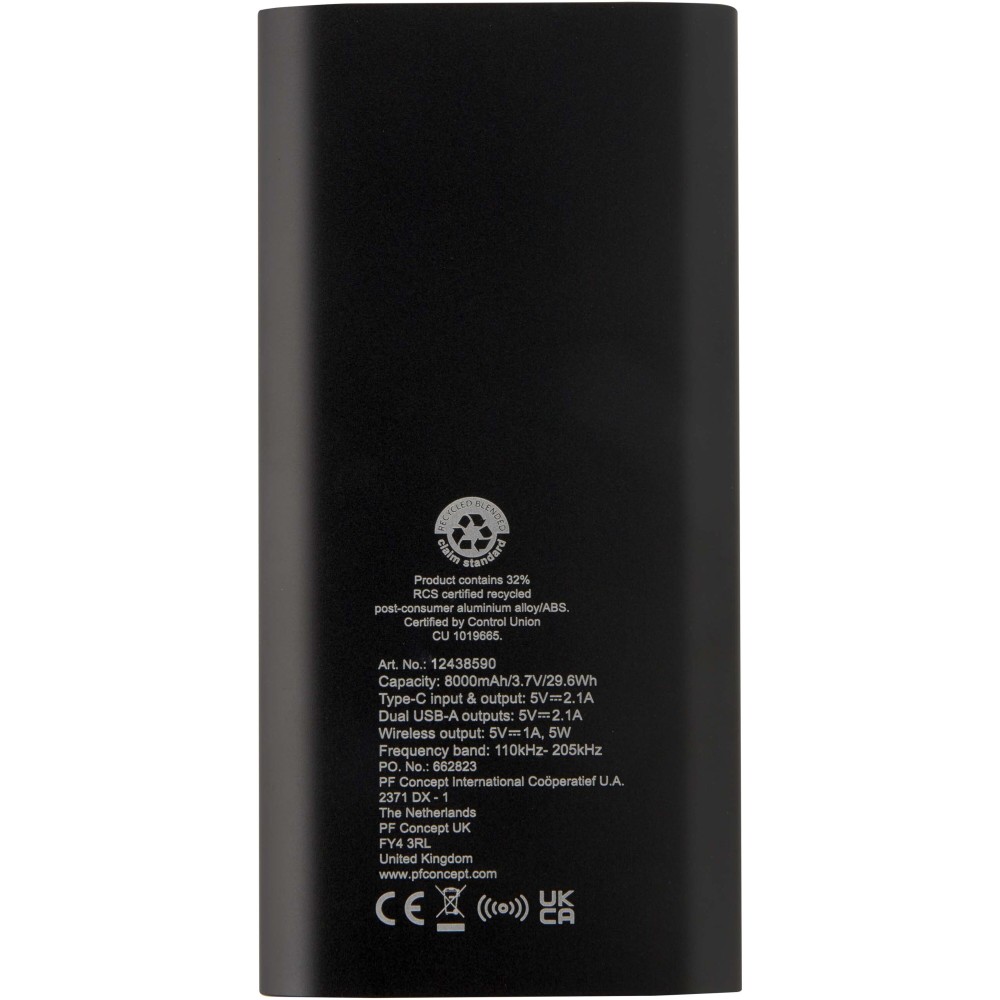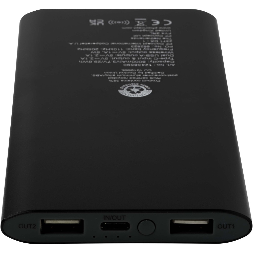 Powerbank Type-C bemeneti/kimeneti porttal és 2 db USB-A porttal, amelyek lehetővé teszik három eszköz egyidejű töltését. Támogatja az 5W vezeték nélküli töltést minden Qi-kompatibilis eszköz számára. A powerbank 8000 mAh kapacitású lítium-polimer akkumulátorral rendelkezik, amely max. 10W teljesítményt biztosít. A powerbank 28%-ban RCS tanúsítvánnyal rendelkező újrahasznosított műanyagból készült. TPE Type-C - USB-A töltőkábellel szállítjuk.