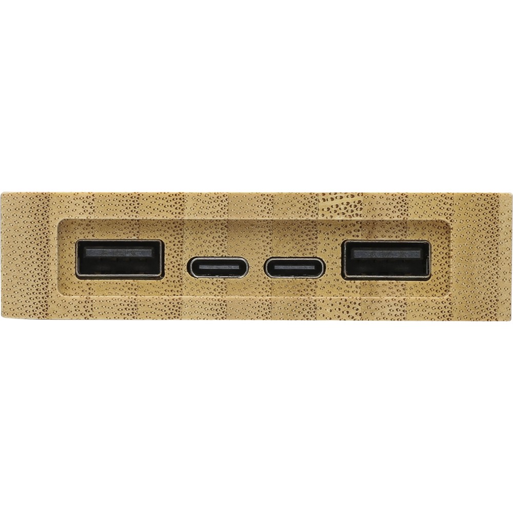 Bambusz napelemes powerbank 10.000 mAh kapacitással, dual USB-A és USB-C porttal, vezeték nélküli töltés funkcióval, beépített napelemes panellel és 5 db LED jelzőfénnyel. 30 cm-es fehér kábel tartozik hozzá. Csomagolása barna papírdoboz.